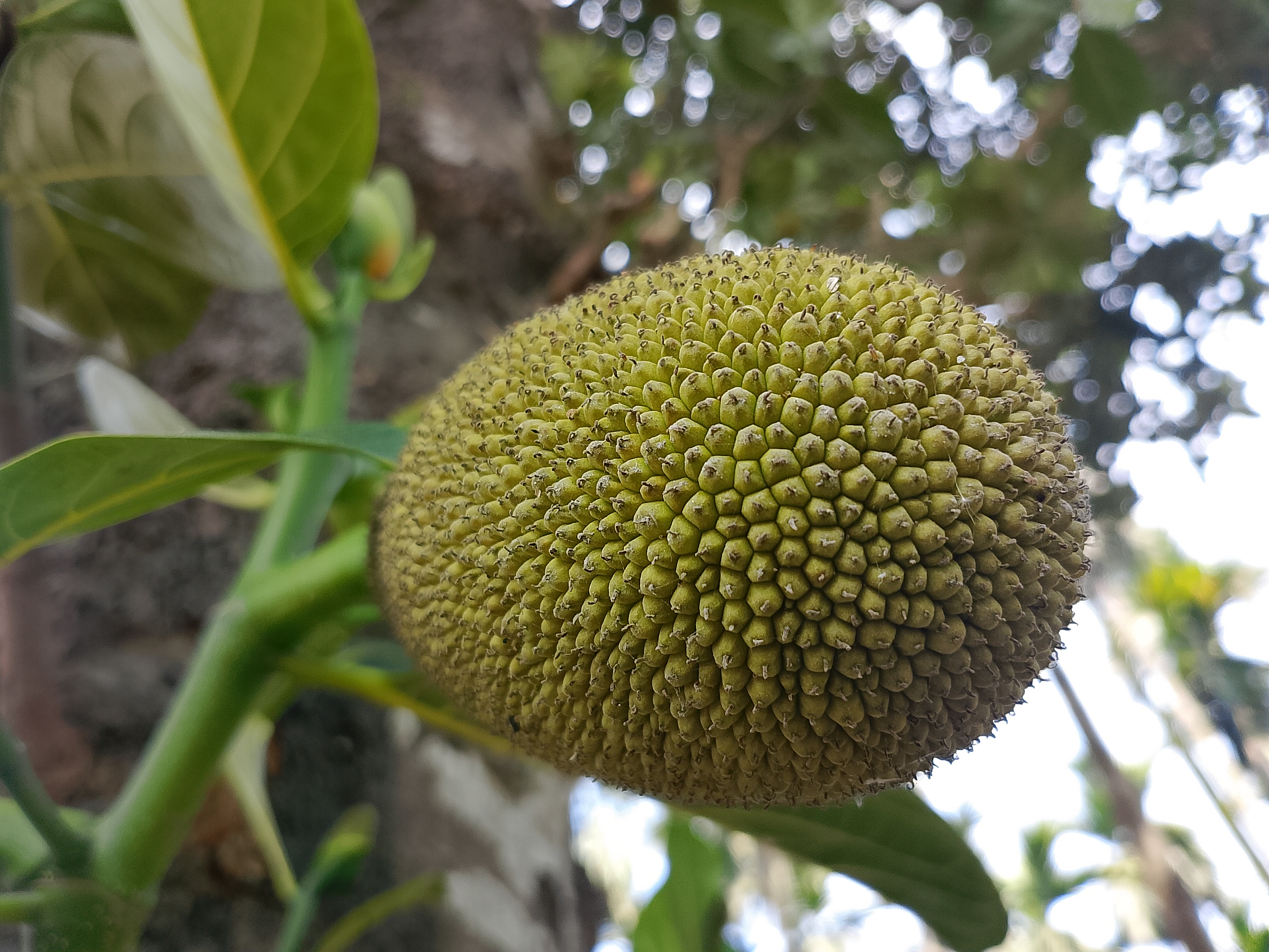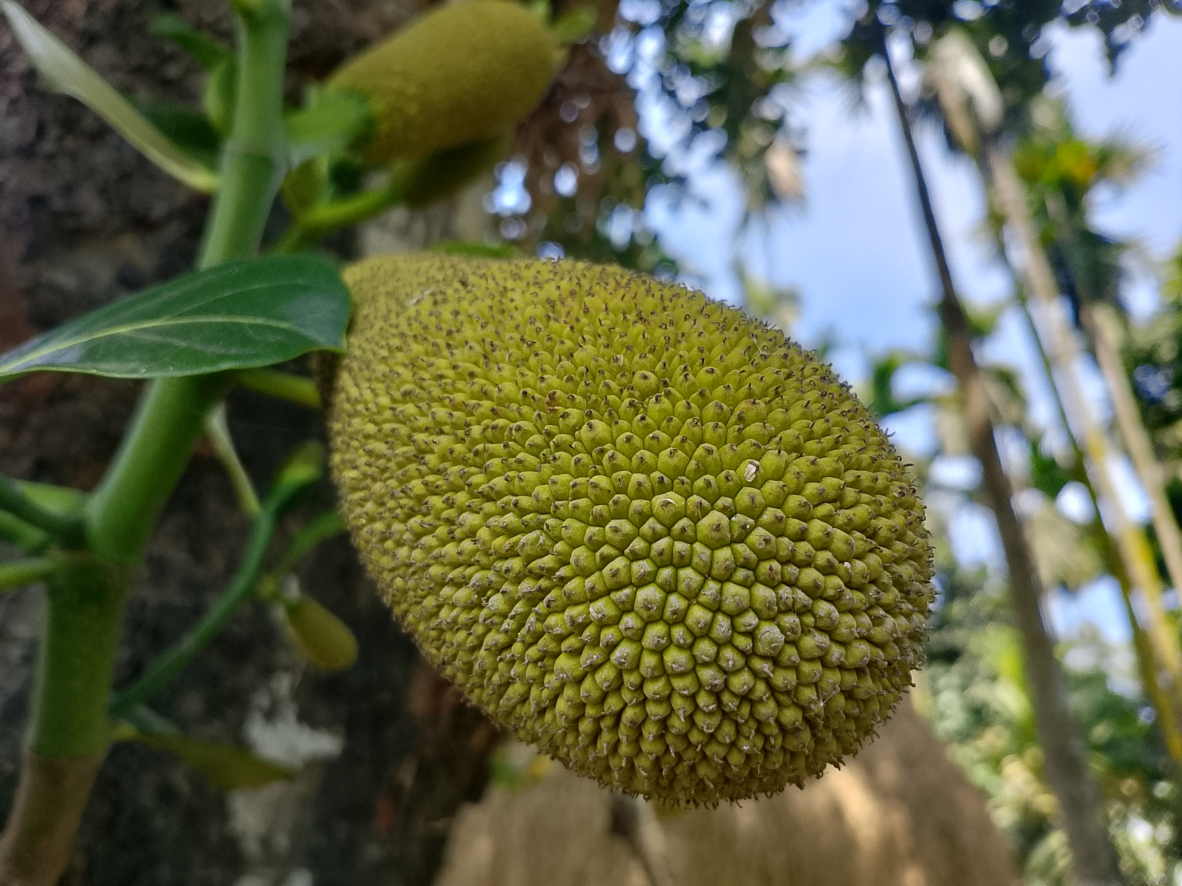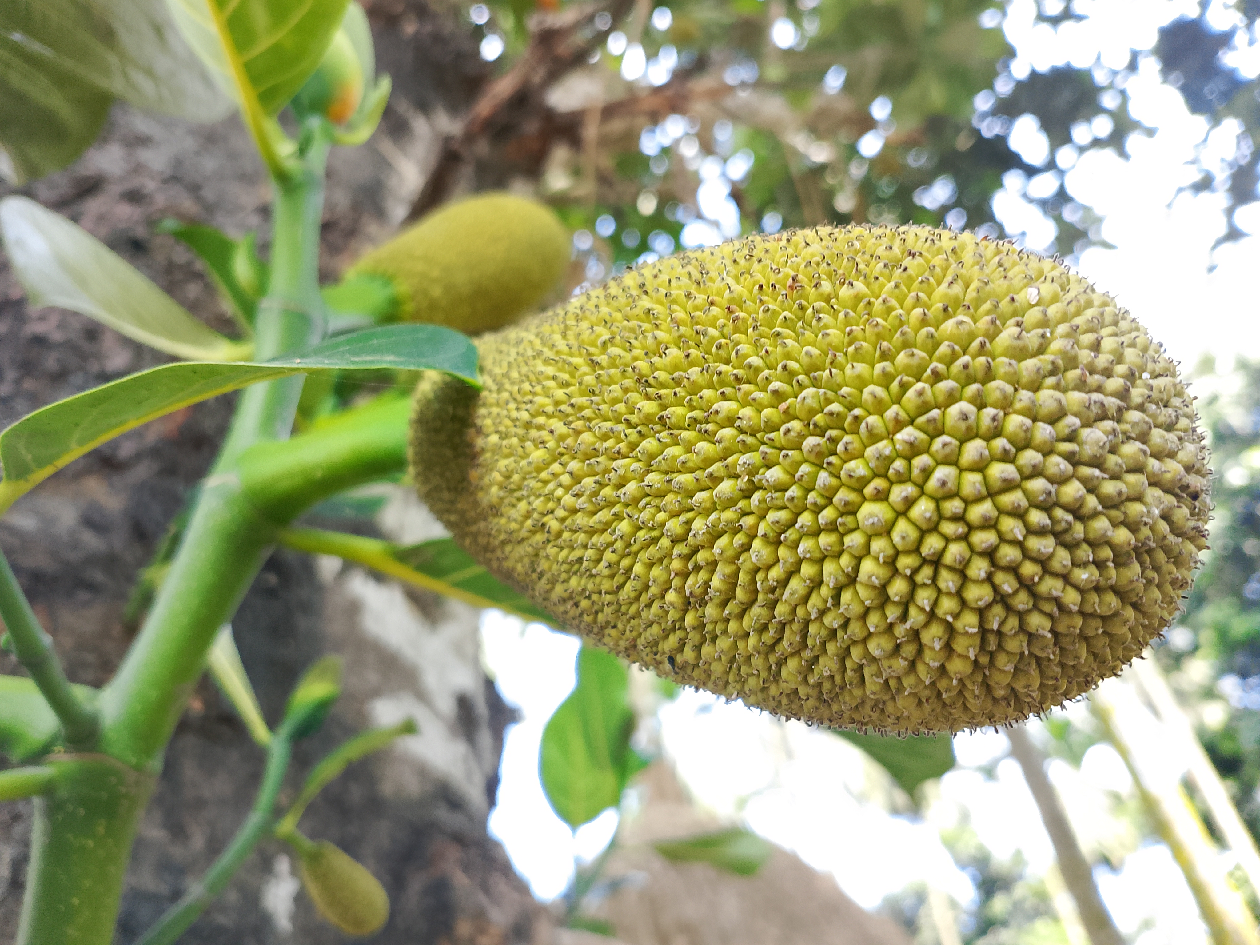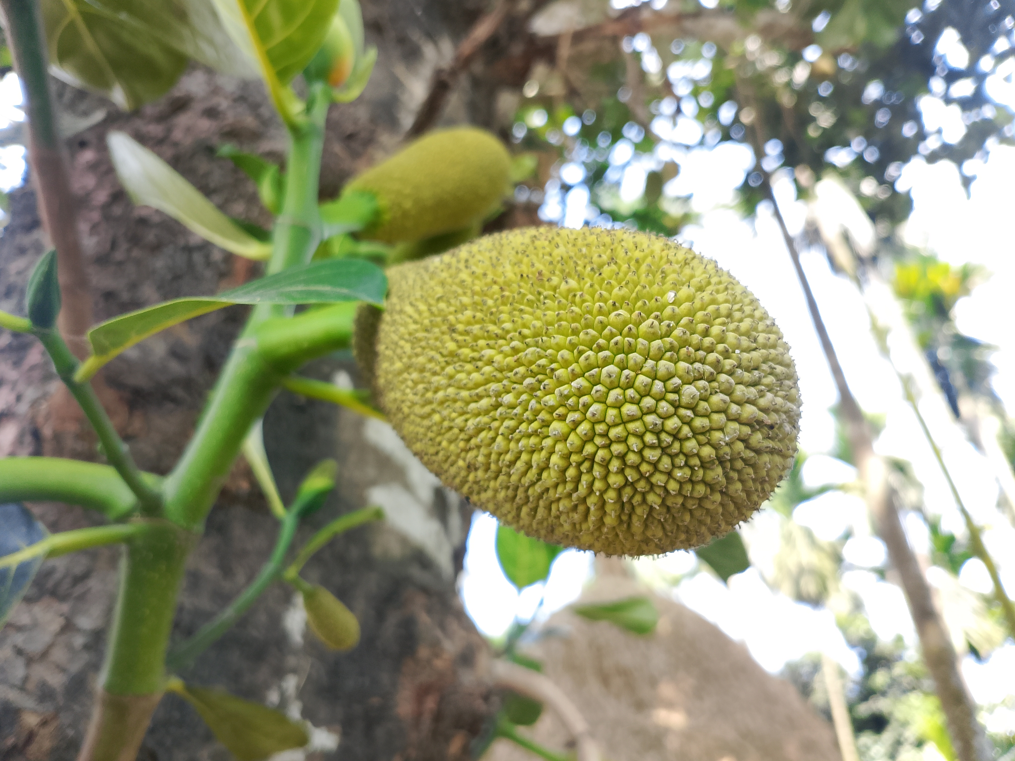 In our country, jackfruit is a popular food. The smaller parts of the jackfruit can also be used to prepare a nice dish. It can be eaten with salt and chili. This is very good and enjoyable. However, during storms, some of the young fruits fall off, and the remaining jackfruits gradually grow bigger and can be eaten nicely.