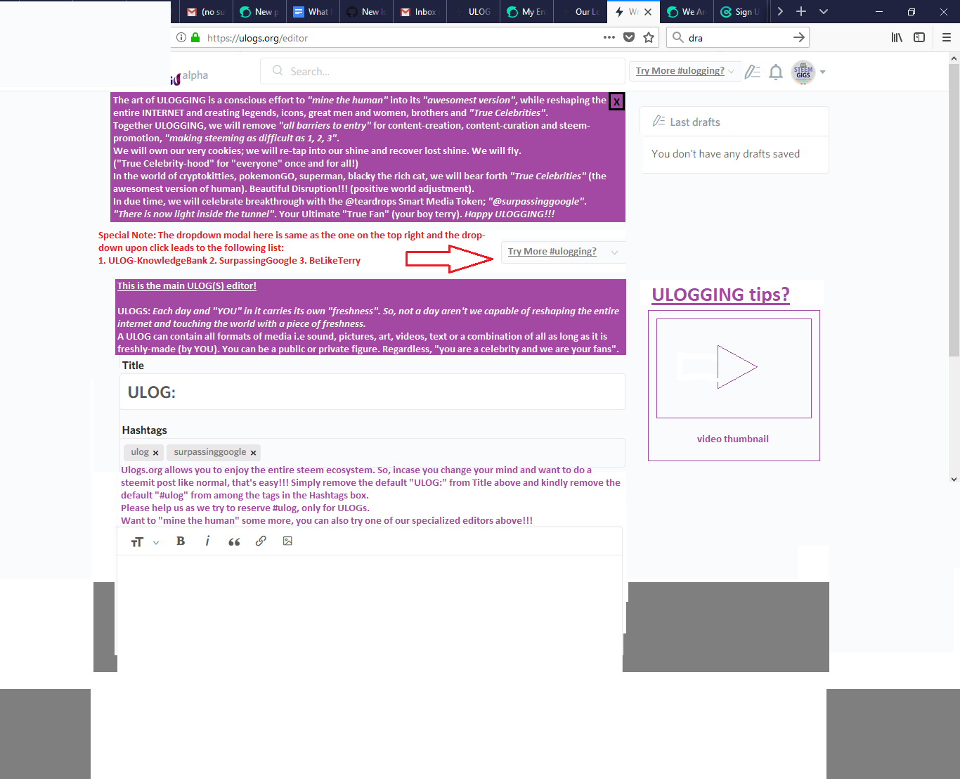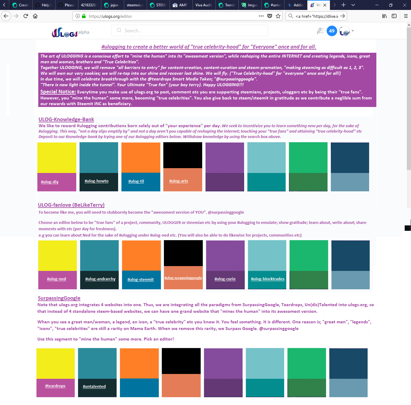 Note that ulogs.org integrates 4 websites into one. Thus, we are integrating all the paradigms from SurpassingGoogle, Teardrops, Un(dis)Talented into ulogs.org, so that instead of 4 standalone steem-based websites, we can have one grand website that "mines the human" into its awesomest version.