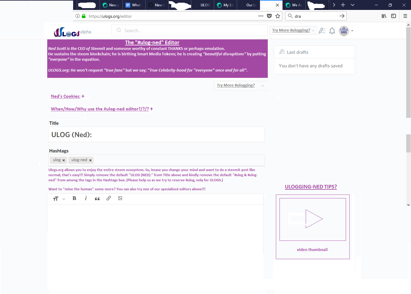 e.g you can learn about Ned for the sake of #ulogging under #ulog-ned etc You will also be able to do likewise for projects, communities etc