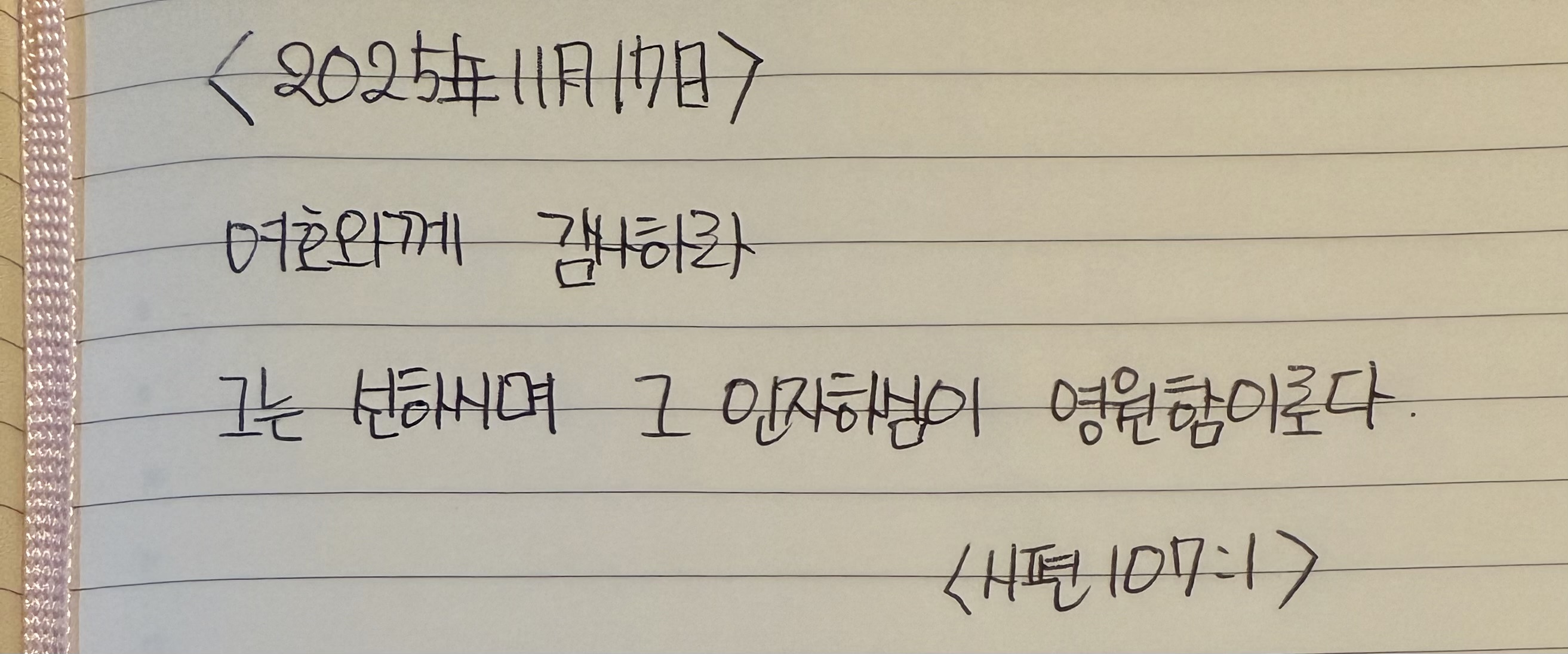 오늘의 심비 25/11/17matildah (66)in #steem • 5 months ago 여호와께 감사하라 그는 선하시며 그 인자하심이 영원함이로다 <시편 107:1> Give Thanks to the LORD. For he is good; His love endures forever. #church #bible #kr #mini #dblog #krsuccess #palnet