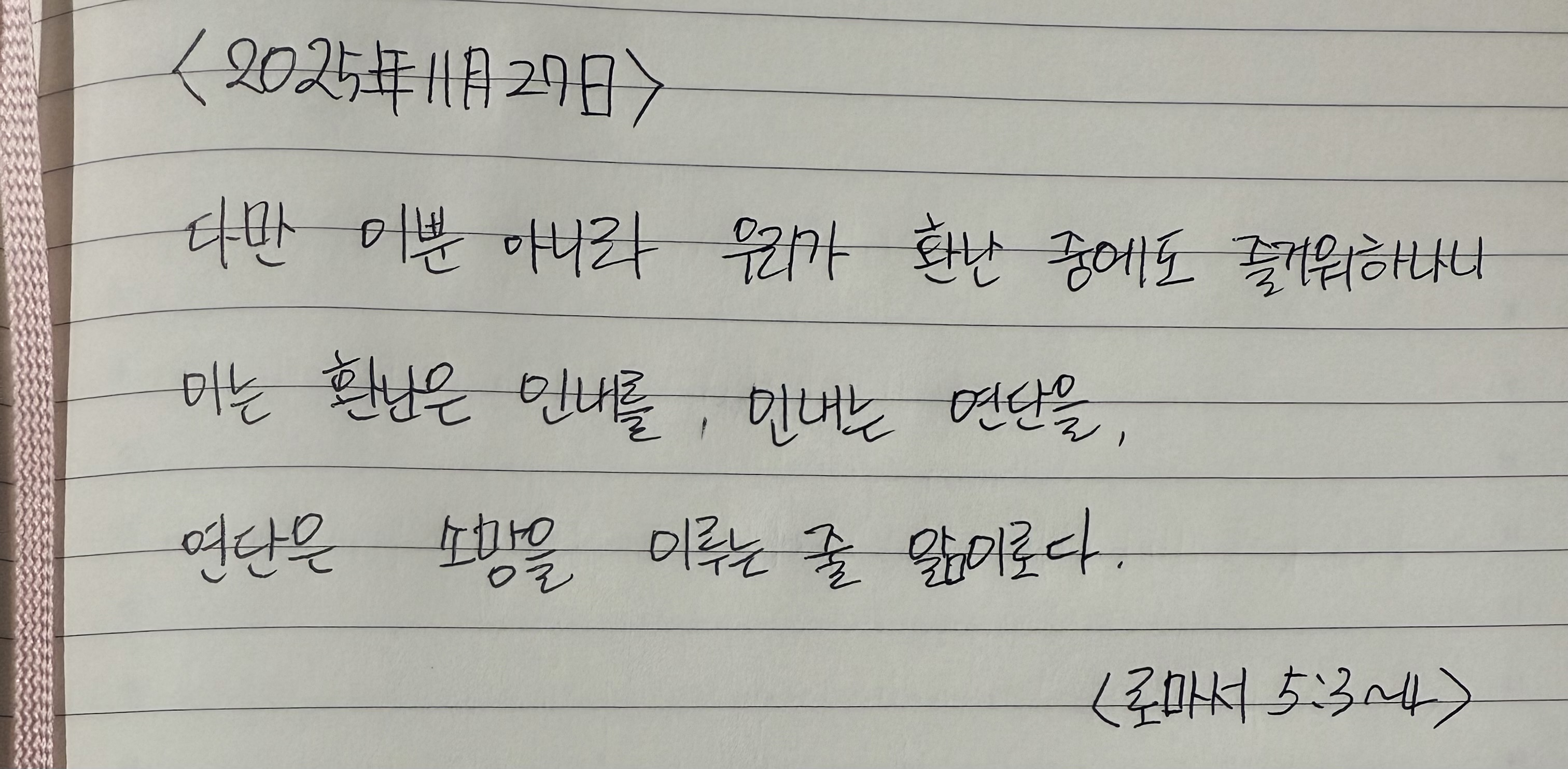 오늘의 심비 25/11/27matildah (66)in #steem • 5 months ago 다만 이뿐 아니라 우리가 환난 중에도 즐거워 하나니 이는 환난은 인내를, 인내는 연단을, 연단은 소망을 이루는 줄 앎이로다 <로마서 5:3~4> #church #bible #kr #mini #dblog #krsuccess #palnet