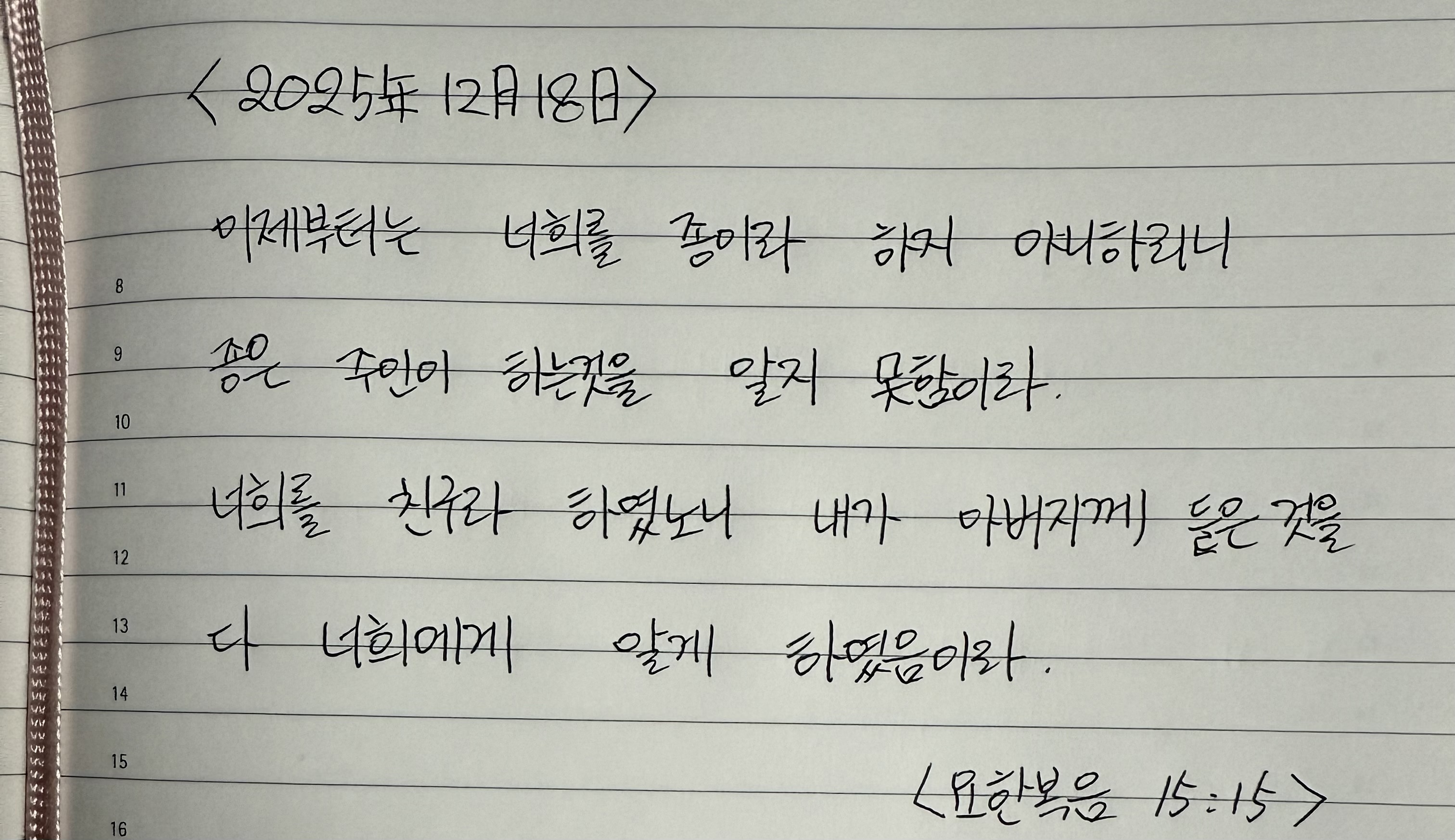 너희를 친구라 하였노니 내가 아버지께 들은 것을 다 너희에게 알게 하였음이라 <요한복음 15:15>