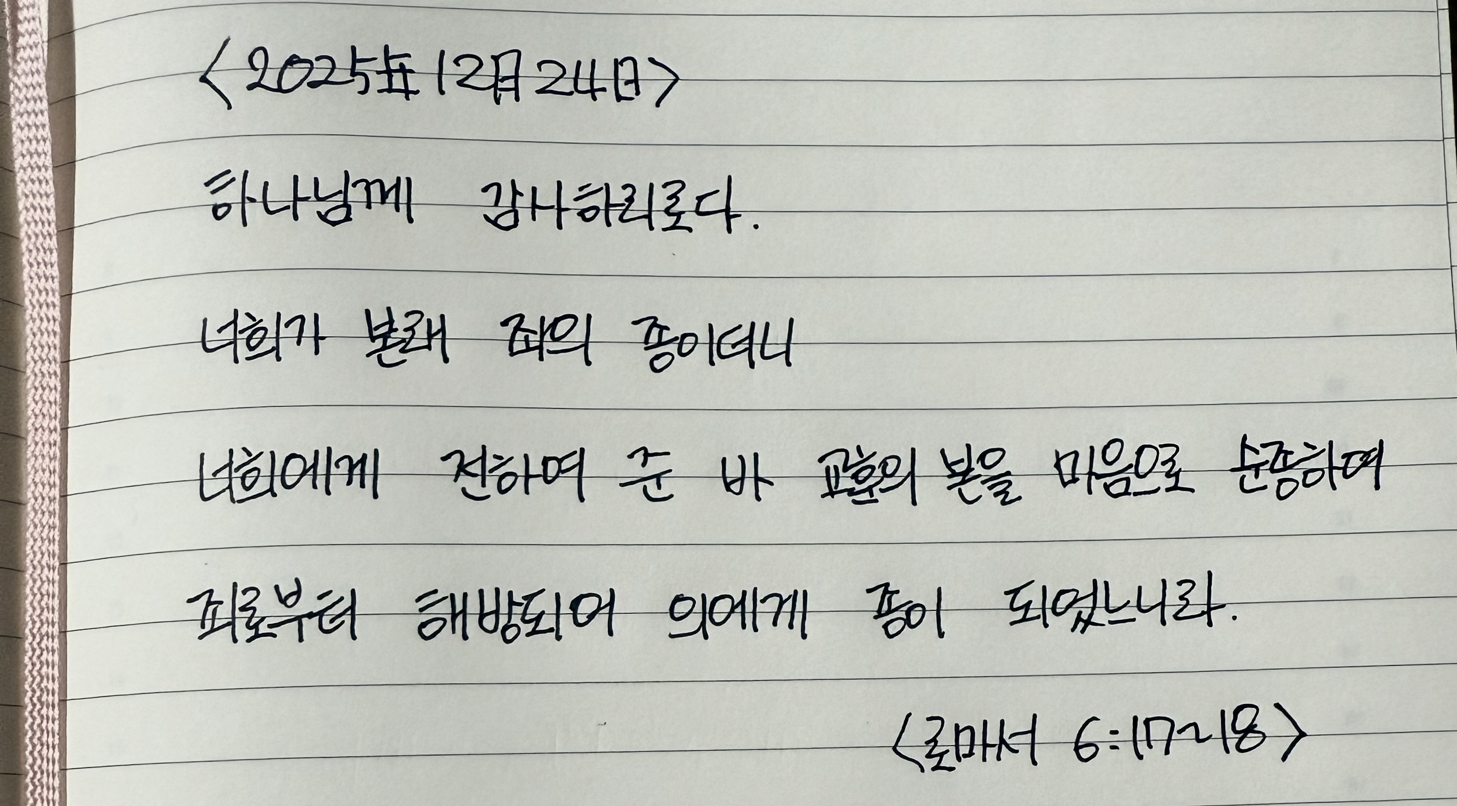 너희가 본래 죄의 종이더니 너희에게 전하여 준 바 교훈의 본을 마음으로 순종하여 죄로부터 해방되어 의에게 종이 되었느니라 <로마서 6:17~18>