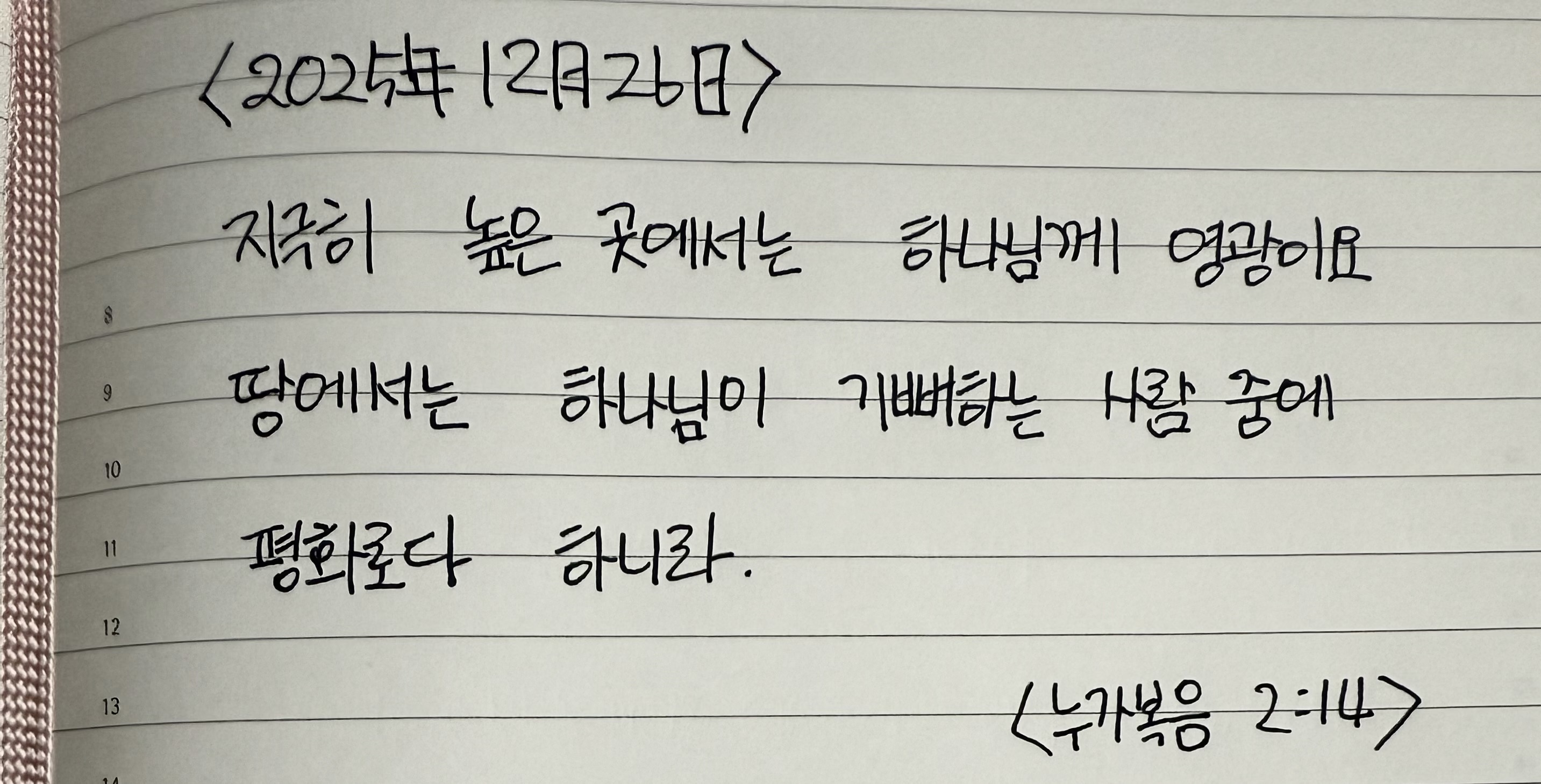 오늘의 심비 25/12/26matildah (66)in #steem • 4 months ago 지극히 높은 곳에서는 하나님께영광이요 땅에서는 하나님이 기뻐하는 사람중에 평화로다 하니라 <누가복음 2:14> Glory to God in the highest, and on earth peace to men on whom his favor rests. #church #bible #kr #mini #dblog #krsuccess #palnet