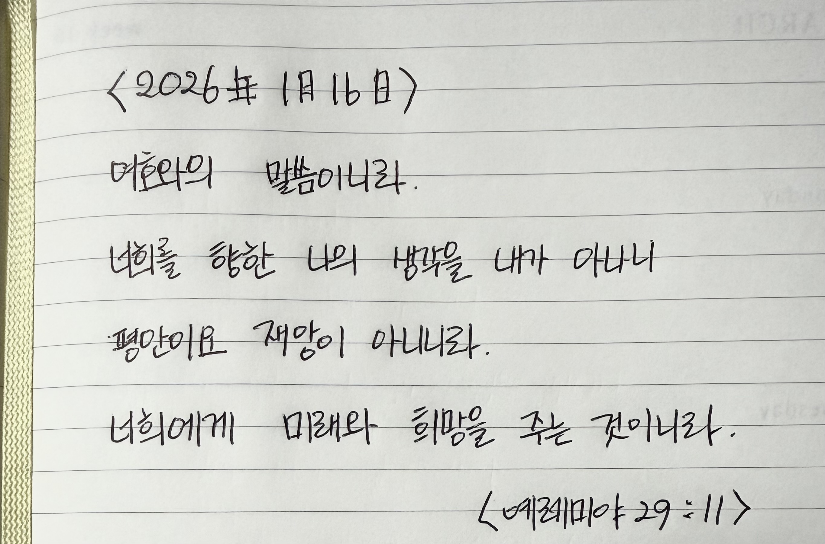 여호와의 말씀이니라 너희를 향한 나의 생각을 내가 아니니 평안이요 재앙이 아니니라 너희에게 미래와 희망을 주는 것이니라 <예레미야 29:11>