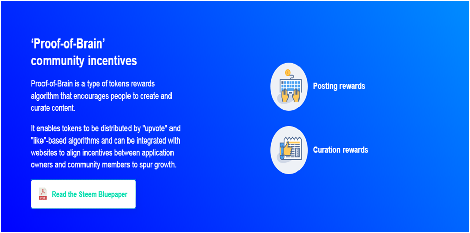 Steem provides a scalable blockchain protocol1 for publicly accessible and immutable content, along with a fast and fee-less digital token (called STEEM) which enables people to earn the currency by using their brain (what can be called “Proof-of-Brain”).