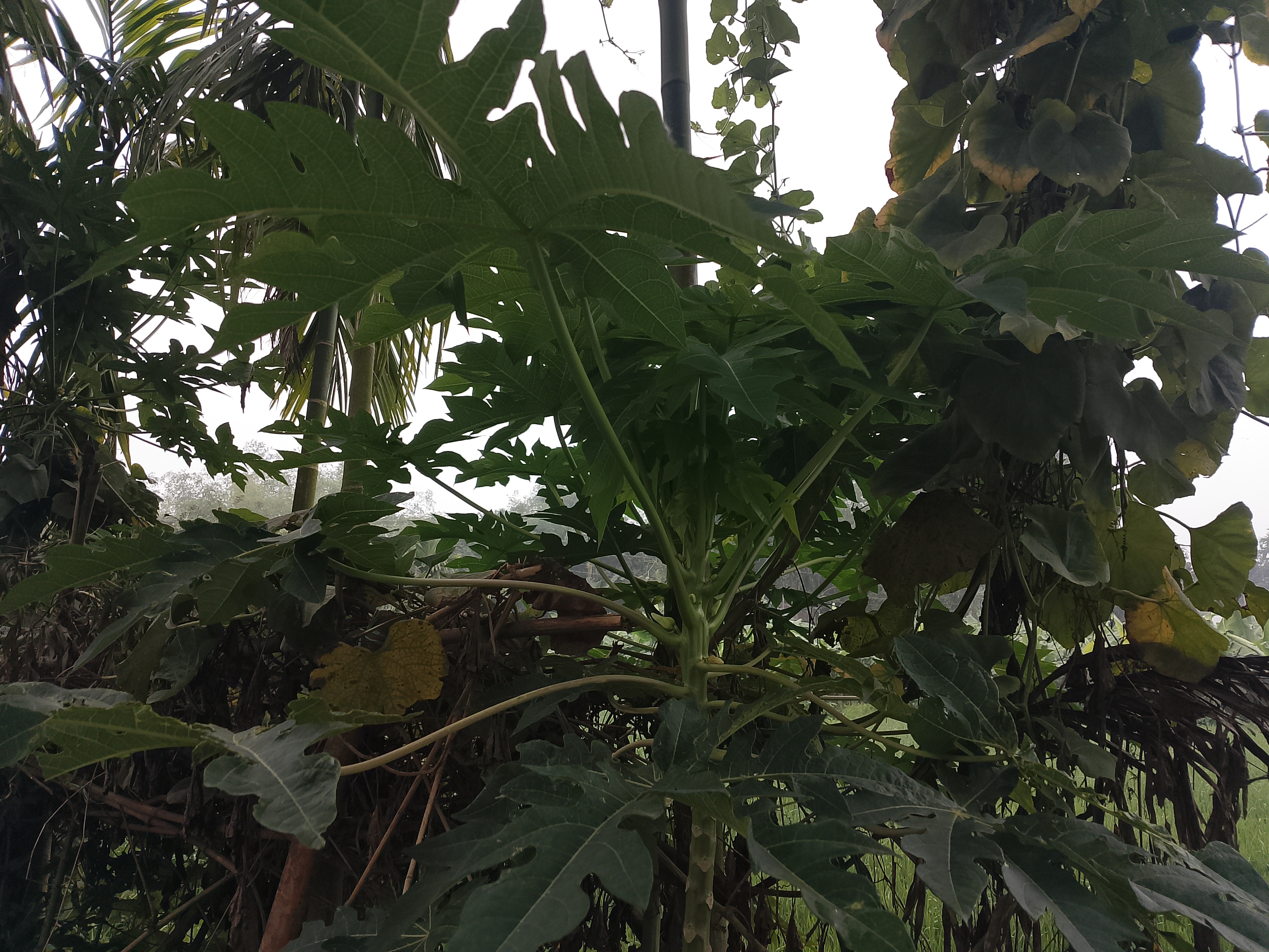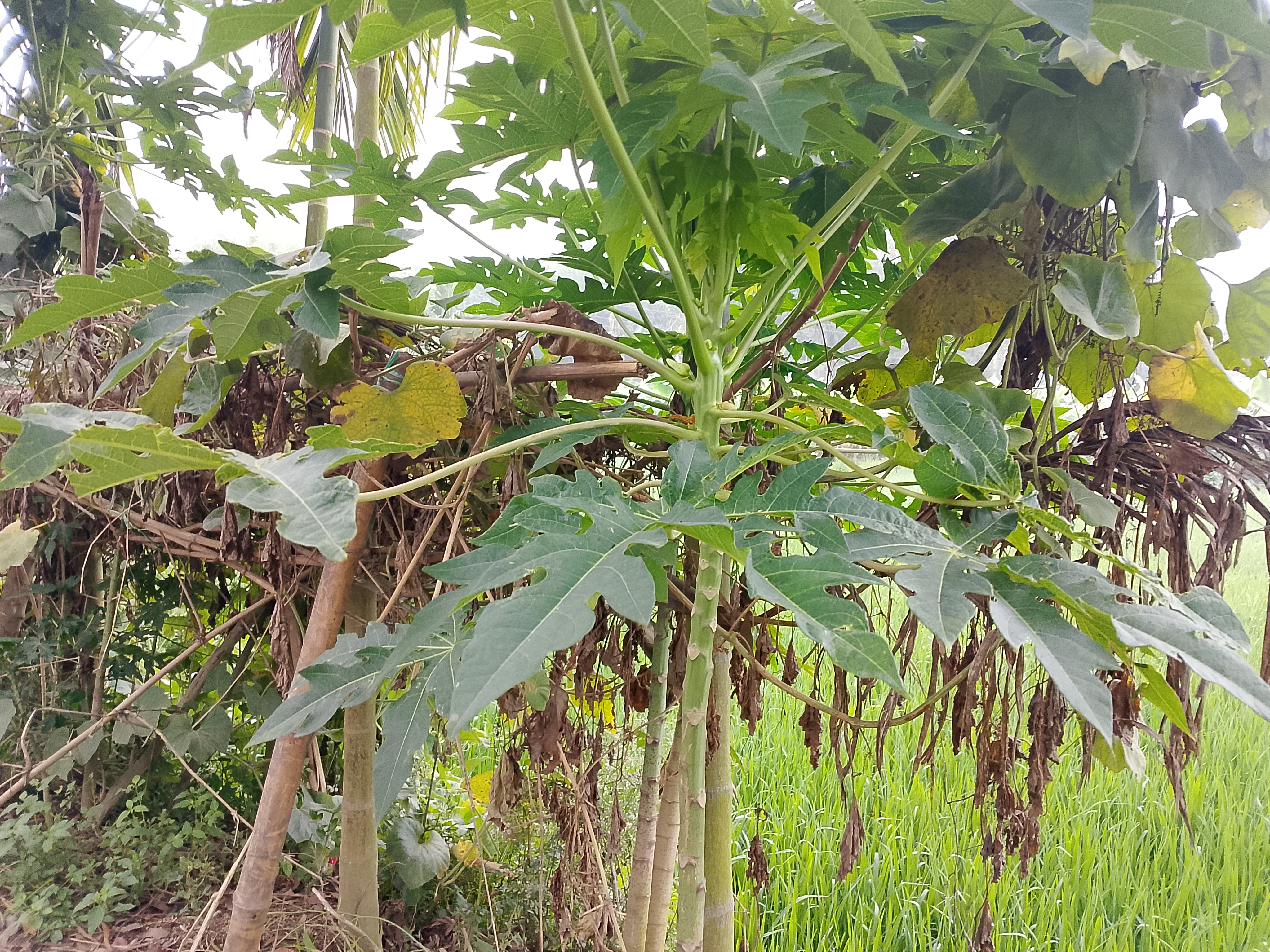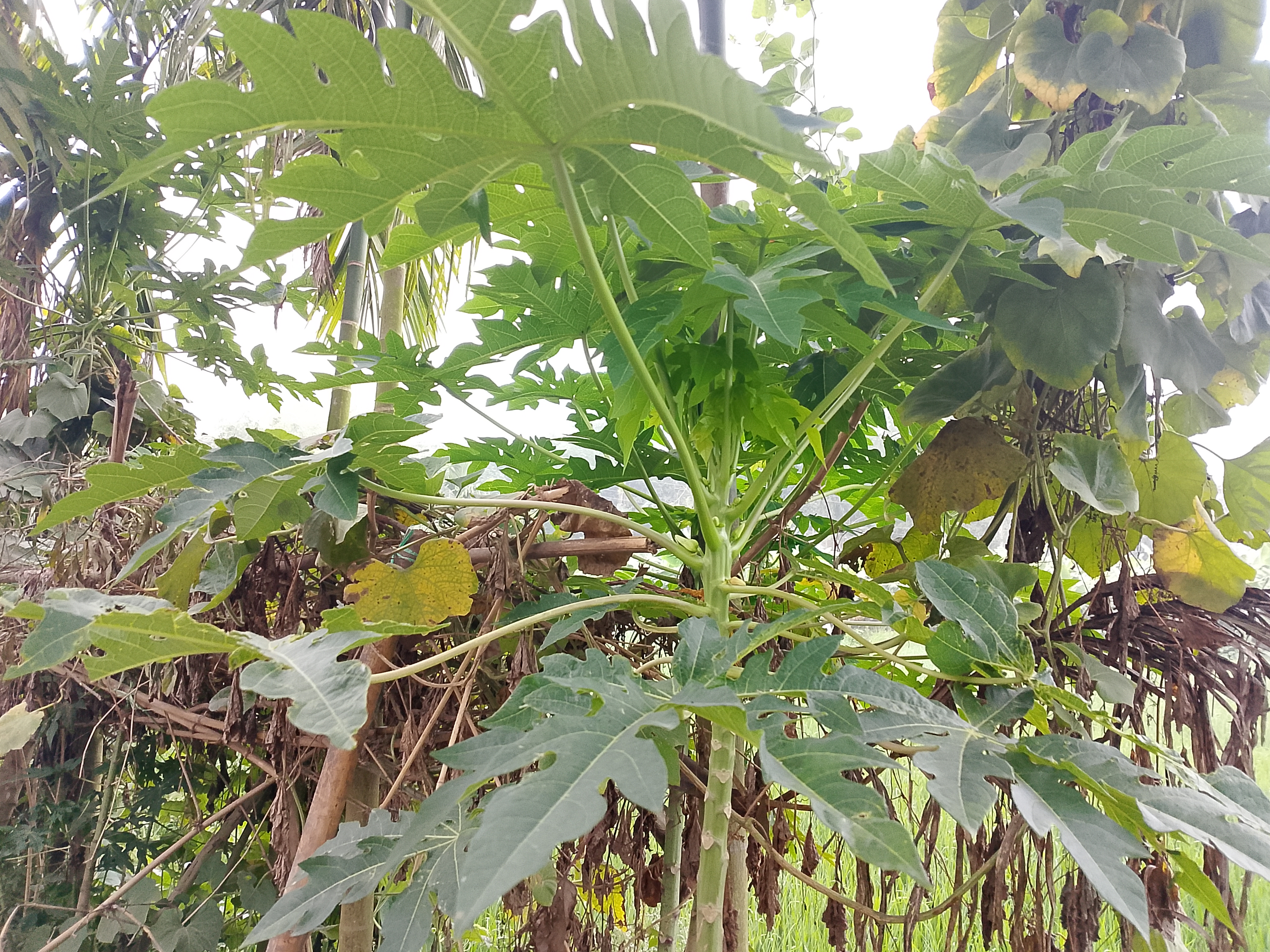 There is a papaya tree here. It can be seen that there are various other plants growing around it. The papaya tree is gradually growing bigger.