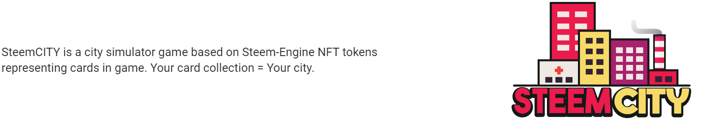 Lately was realised new steem game called "SteemCITY" what is a city simulator game based on Steam-engine NFT tokens representing cards in game. Your card collection = Your city.
