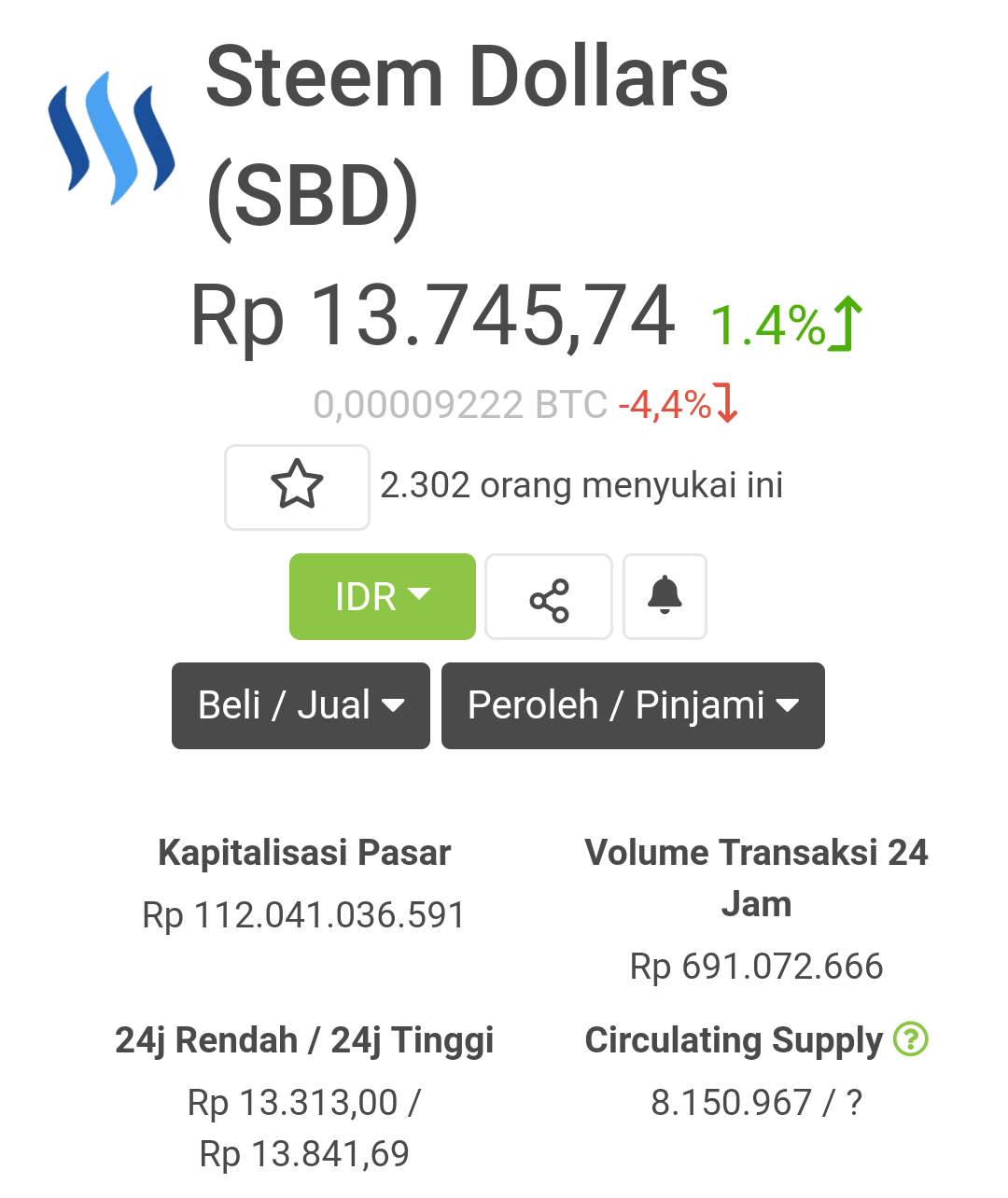 Begitu pula dengan harga Steem Dollar (SBD) masih bertahan di angka Rp. 13.745,- seperti pada gambar dibawah ini: