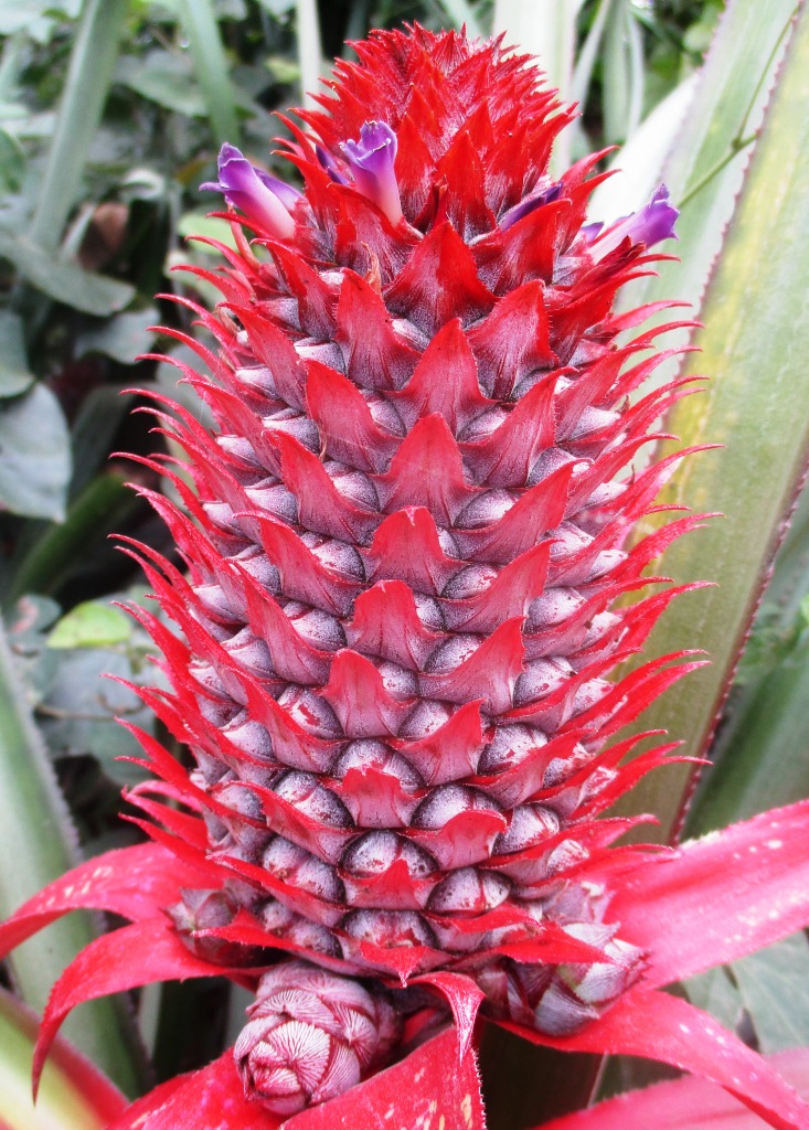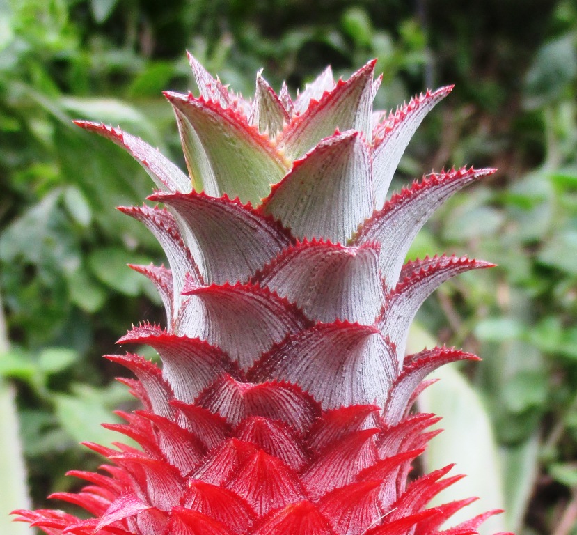 The shoot creeps on the base. The leaves gather in the root rosette and on the base it widens into a midrib. Sword-shaped leaf blade, thick, clayy, 80 - 120 cm long, 2 - 6 cm wide, pointed tip resembles thorns, spiny edges that bend upward, scaly underside, green or reddish green. Compound interest is arranged in a very tight grain, the terminal is located and has a long stem. The fruit is buni fruit compound, long round, fleshy, green, if the color is yellow. Pineapple tastes good, sour to sweet. The seeds are small, often not finished.