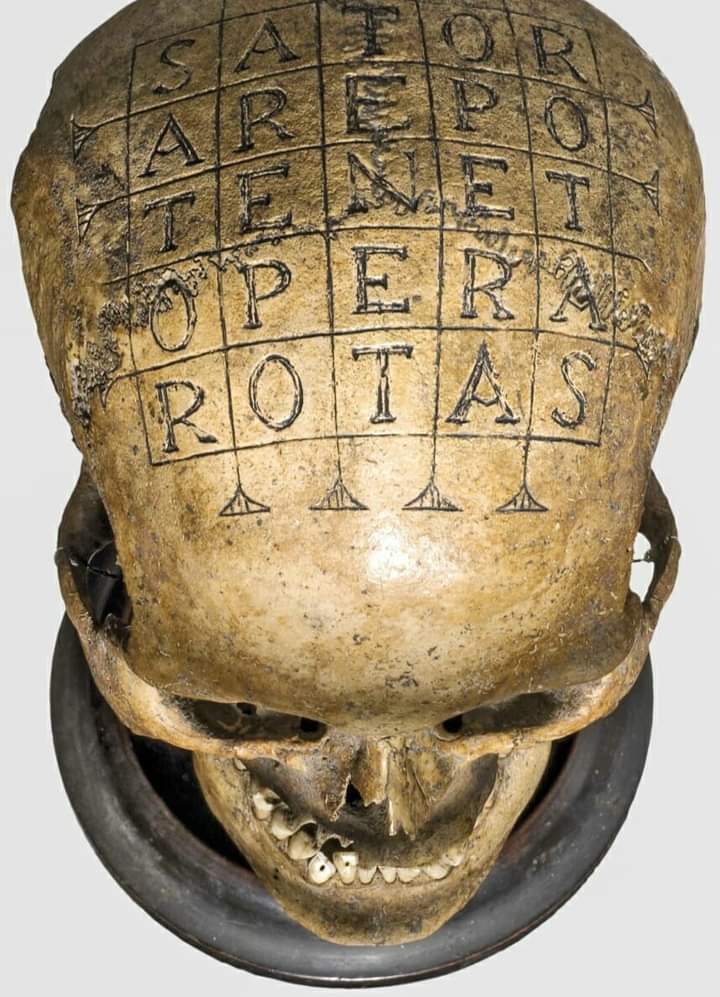 Human skull,Sator formula in the letter square (Latin) "Sator Arepo Tenet Opera Rotas" ("The Creator [=Sator/Sower] [he]preserves his works") scratched on the skull and read as a palindrome. In the Middle Ages, oath skulls were used, among other things, as objects of jurisdiction and later found their place in cabinets of curiosities.