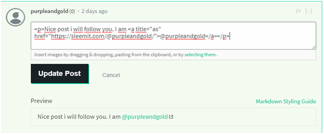 the hacker was using a pretty simple bait. What he did is basicly putting the url to a place he wans't you to enter with using "<.a .href=.....>" commands(the same like HTML code). But the link you see says something different. In this example he made it appear as a link to one of my actual posts, or just a link to my account. The url he hid leads to a website called „sleemit(dot)com“, which looks very similar to Steemit but is used to steal passwords. (I noticed these things when I was editing the comments in order to erase the dangerous content he left)
