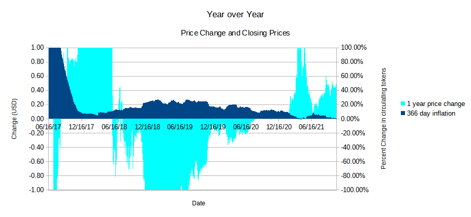 It's off topic, but before moving on, let's just pause and recognize that these numbers show a 4x year-over-year increase in price. When you get caught up in the short term, it's easy to overlook things like that, but a one year increase from $0.15 to $0.60 is nothing to sneeze at. Anyway, back to "inflation" as measured by coinmarketcap...