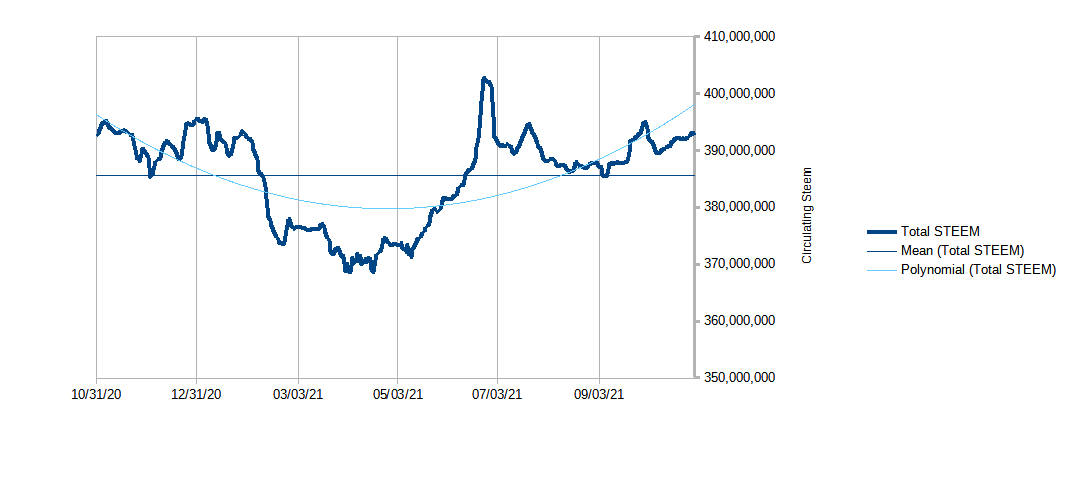 Update: The above table has now been updated with values from November 1, 2021. So, by coinmarketcap's estimation, the number of circulating STEEM tokens declined by 420,357 from November 1, 2020 through November 1, 2021. End Update