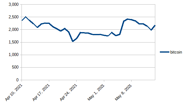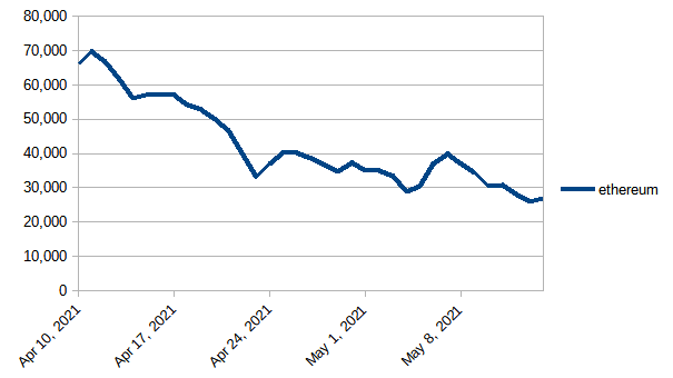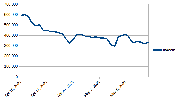 In terms of litecoin, powered up STEEM is down compared to last week and two weeks ago. Overall, it looks mostly like parallel motion since late April, though.