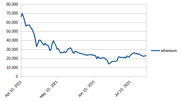 ETH gained a smidgeon against powered-up STEEM during the last week, but today's value is right in the middle of the range from the last two weeks - which ranged from about 21,500 to 25,000 ETH.