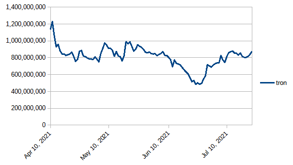 After recovering from its June drops, the value of powered-up STEEM in terms of TRX is solidly back in the 800 million to 1 billion trading range where it seems so comfortable.