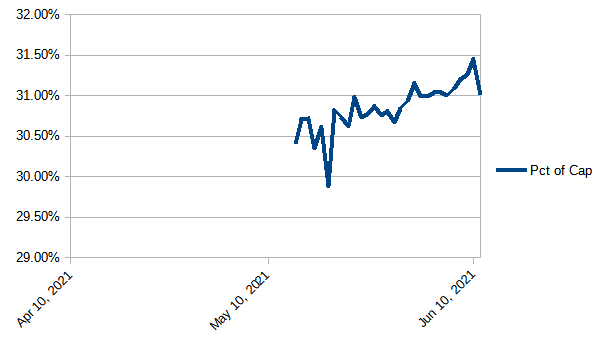 Still my favorite graph. At 31.45%, yesterday was the highest value we've seen since May 14, when I changed my reporting data source for market capitalization.