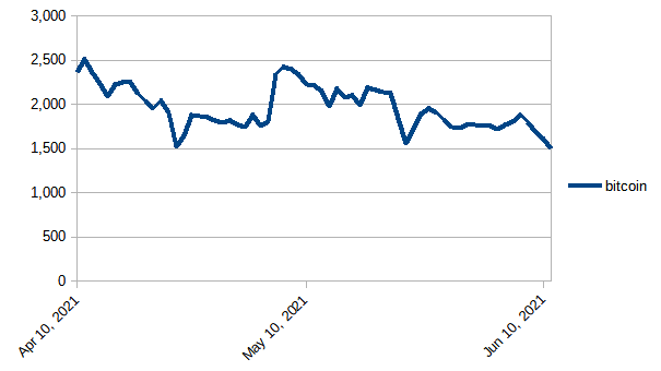 The value of powered-up STEEM in terms of Bitcoin (BTC) declined this week, and - at 1494 - BTC was the strongest in today's download that it has been since I started recording numbers on April 10.