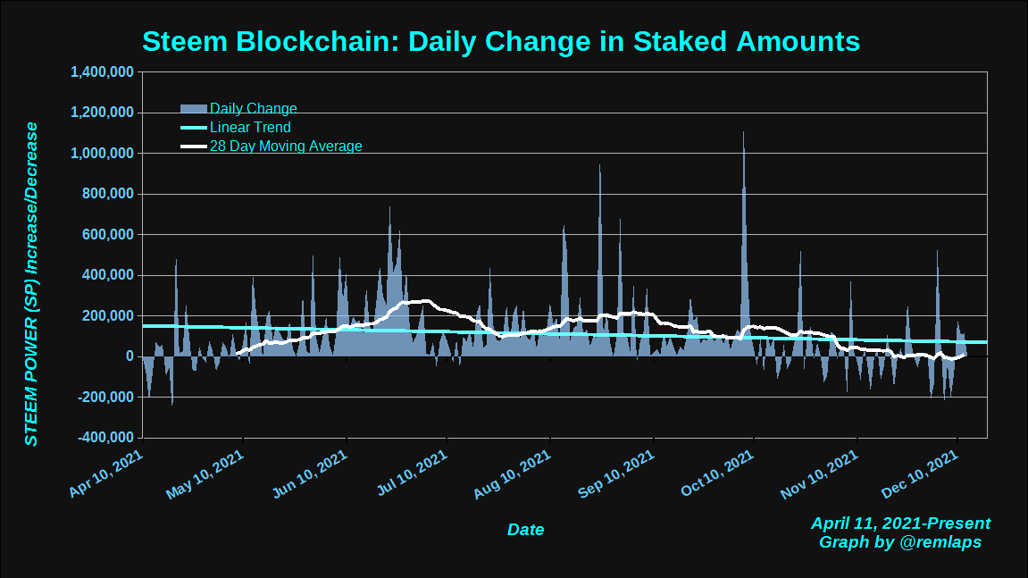 Here is a chart of daily changes in powered-up STEEM from April 11 to present. The graph also includes a linear trend line and a 28 day moving average. Frequent transitions between positive and negative began around October 11 and continued through this week.