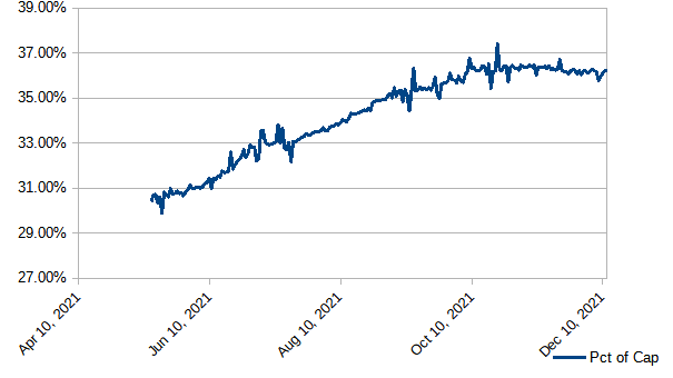 Still flat since early October. After dipping below 36% for a couple of days, we've now seen 3 consecutive days above 36%; 78 consecutive days above 35%; 121 consecutive days above 34%; and 141 straight days above 1/3. Will it hold above 36%? Will we go above 37% again?