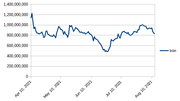 In terms of TRX, the value of powered-up STEEM is down from last week, but still in the familiar 800 million to 1 billion channel.