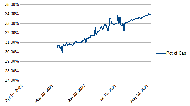 As a percentage of market capitalization, the modeled value of powered-up STEEM has been above 1/3 for 20 consecutive days. It broke above 34% two days ago, then dropped into the high 33s. When I collected the numbers for this post, it was back above 34% again (34.03).
