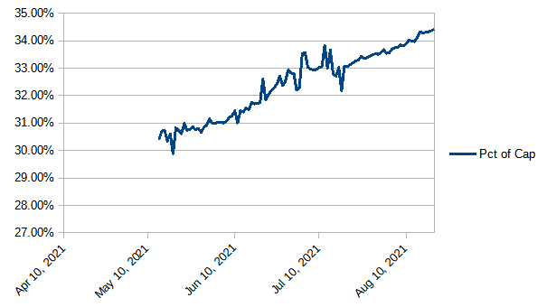27 consecutive days above 1/3 and 7 consecutive days above 34%. Still trending up, with today's new high at 34.42%.
