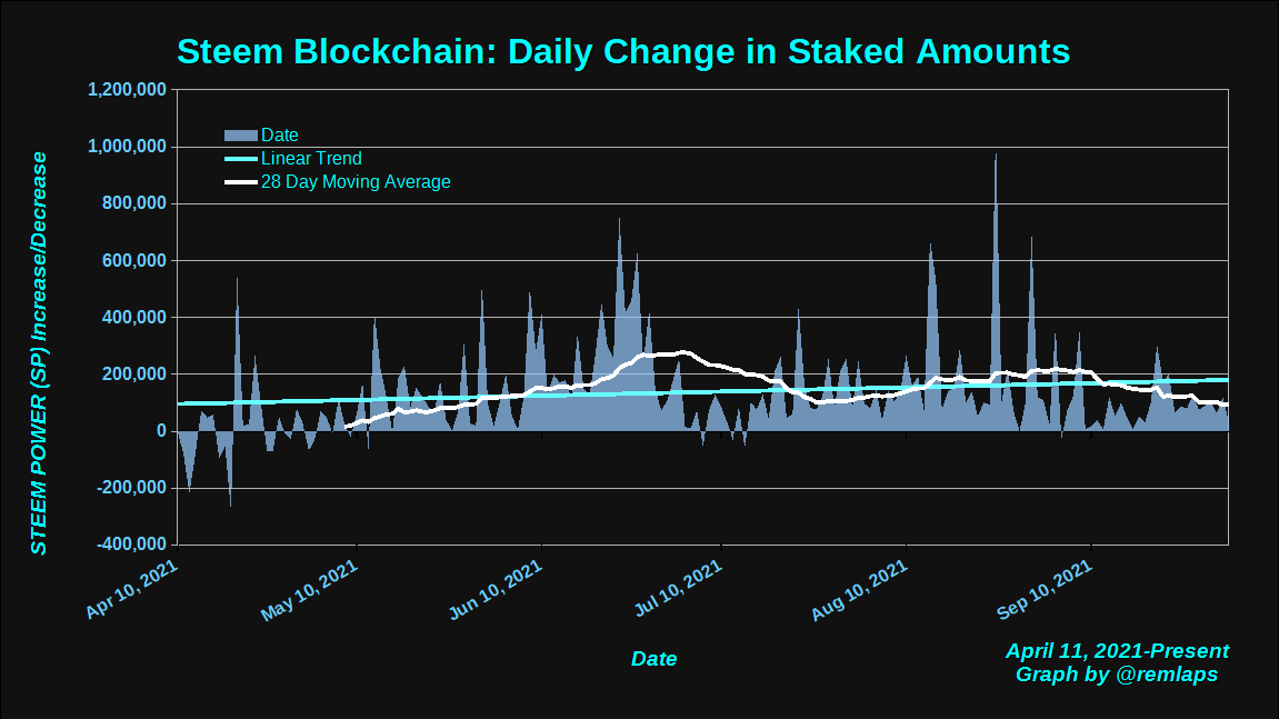 Here is a chart of daily changes in powered-up STEEM from April 11 to present. The graph also includes a linear trend line and a 28 day moving average. Why 28 days? Because that's one power-down cycle.