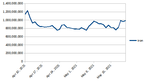 The value of powered-up STEEM in terms of Tron advanced a little bit this week, but it's still moving parallel in the range between 800,000,000 to 1,000,000,000.