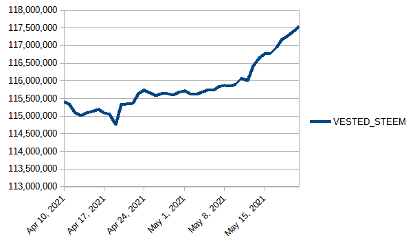 For the third week in a row, the number of powered-up STEEM is the highest value I've seen since I began collecting these numbers. Moreover, it has been climbing sharply for over a week. In a mostly down market, at least this graph is optimistic.