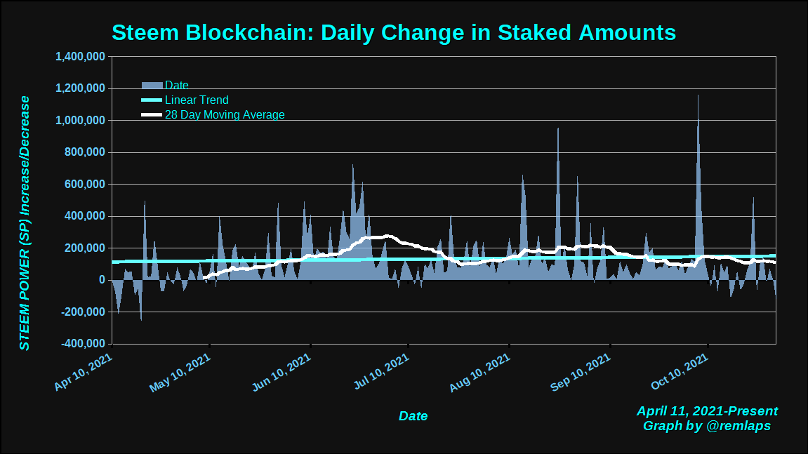 Here is a chart of daily changes in powered-up STEEM from April 11 to present. The graph also includes a linear trend line and a 28 day moving average.