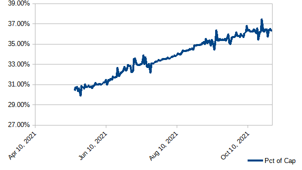 Up a touch, but basically unchanged since last week (and the week before). 4 consecutive days above 36%; 36 consecutive days above 35%; 79 consecutive days above 34%; and 99 straight days above 1/3. Will it hold above 36%? Will we go above 37% again?