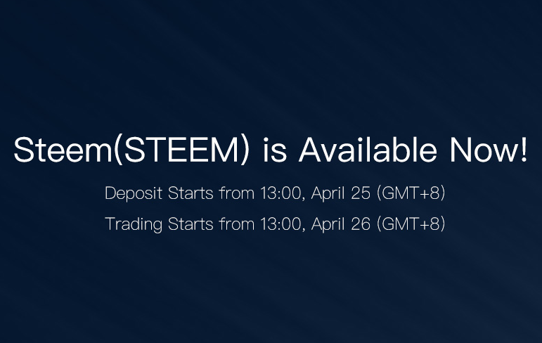 Steem (STEEM) will be launched on Huobi Pro on April 25, 2018 (GMT+8). Deposits will be available from 13:00, April 25 (GMT+8). STEEM/BTC, STEEM/ETH and STEEM/USDT trading will be available at Main Zone from 13:00, April 26, 2018 (GMT+8). Withdrawals will be available from 13:00, April 28 2018 (GMT+8).