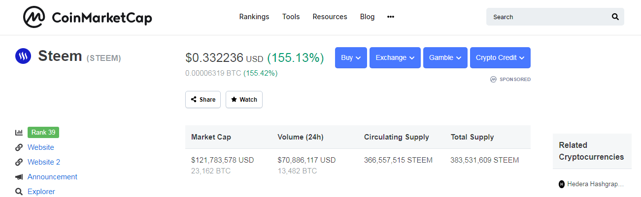 STEEM is now trading at 0.332 at the time of writing this article, which is 155% of yesterday's price. That's really huge because the broader crypto market is flat, no movement at all in altcoin or Bitcoin. So at least as of now STEEM is the king and its mooning and that's a soothing experience for me, becuase I was yearning to see STEEM mooning.