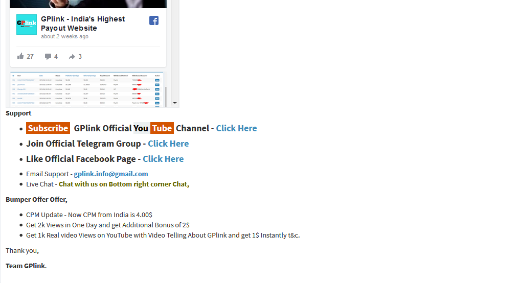 GPLINK LINK SHORTNER WEBSITE PAYS 4$ FOR 1000 VIEWS