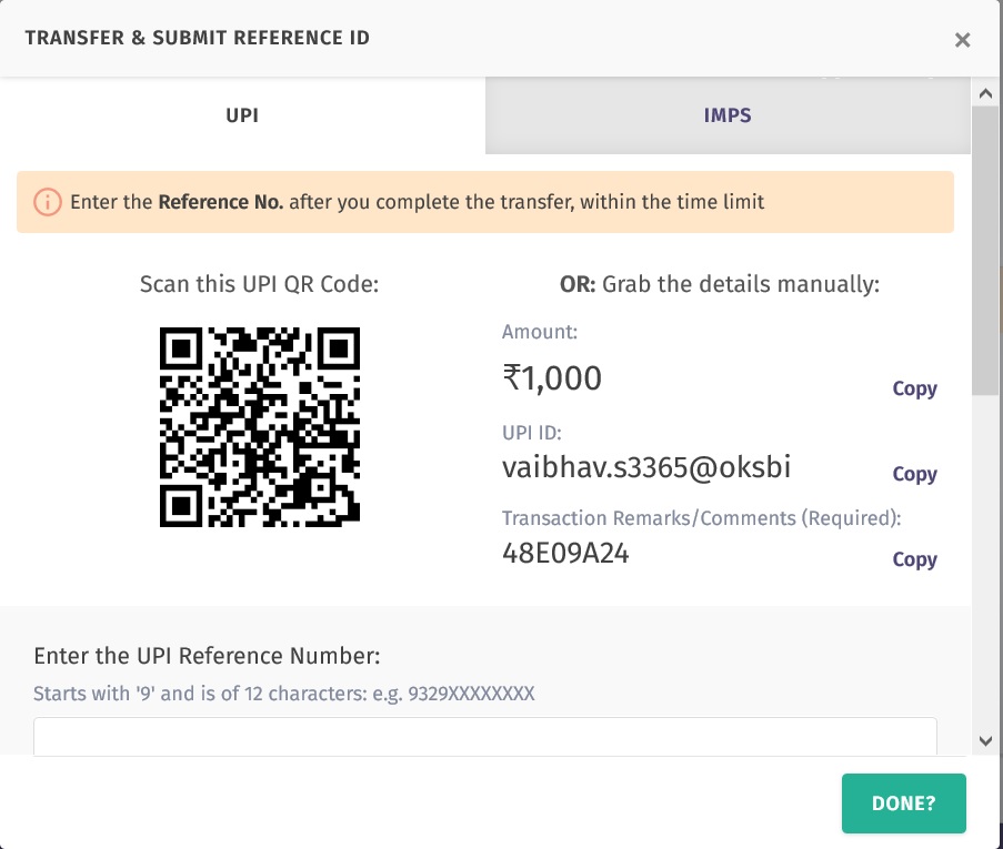 Then you will have to pay that user the specified amount using bank transfer and confirm by submitting the UPI/IMPS reference. I used IMPS and am not a big fan of UPI, because of lot of frauds happening in UPI. But you can choose whatever you like.