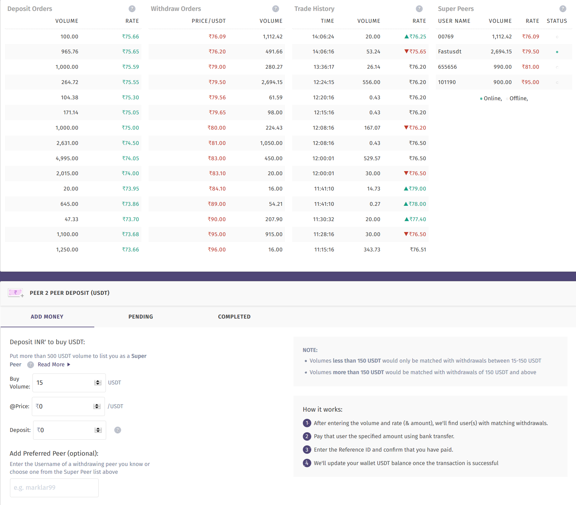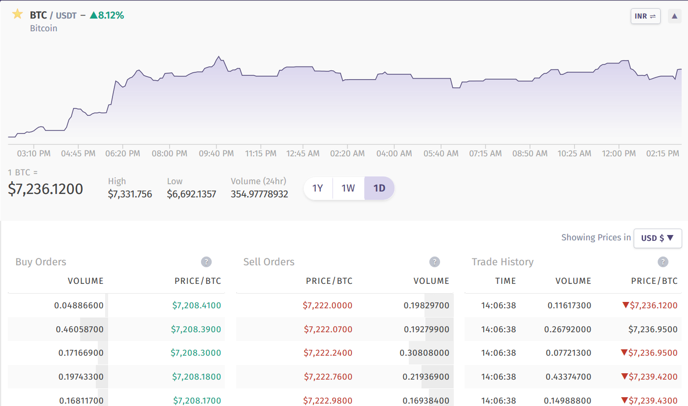 So with the current price, lets say we buy USDT in ₹20000, so with a price of ₹76.09 per USDT, you will be able to buy 262.8466289919832 USDT. And then if you use this to buy BTC at $7,236.12, you get 0.0363242495967429 BTC.