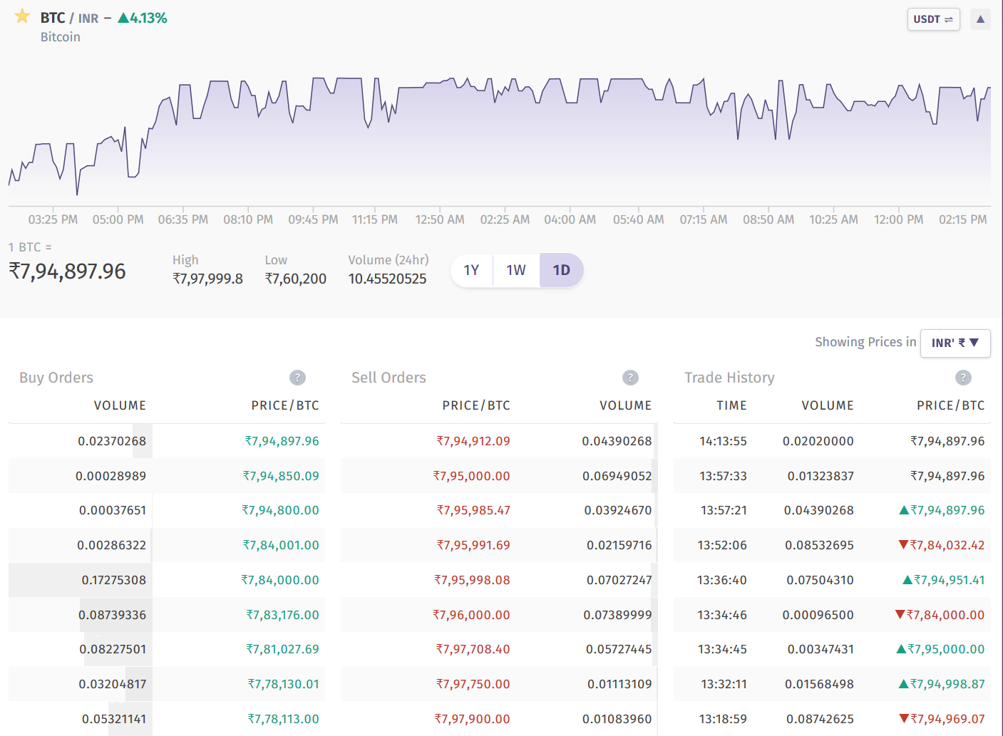 And the price of BTC using INR is ₹7,94,897.96, as you see below. We can only use BTC/INR, if we have deposited INR using the P2P Bank Transfer ( the one I did).