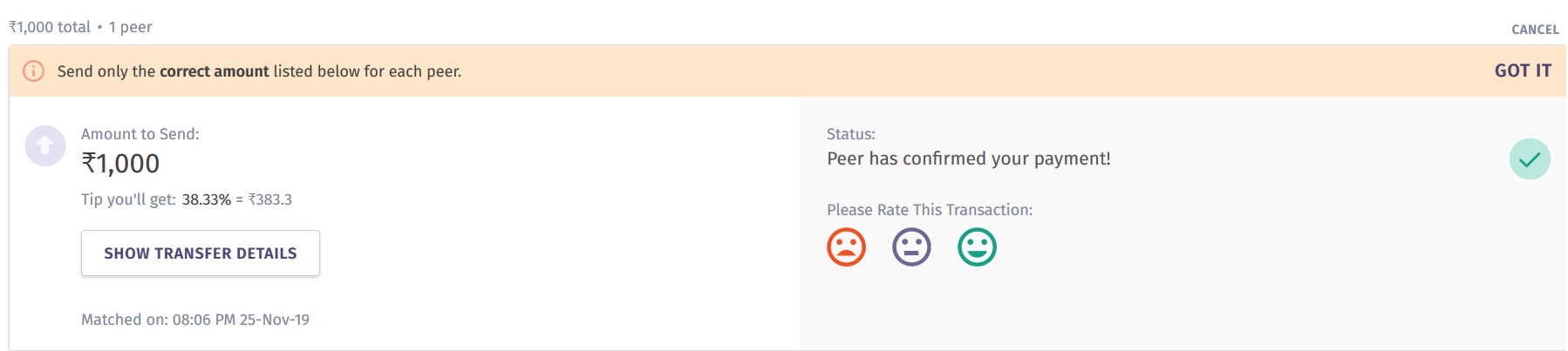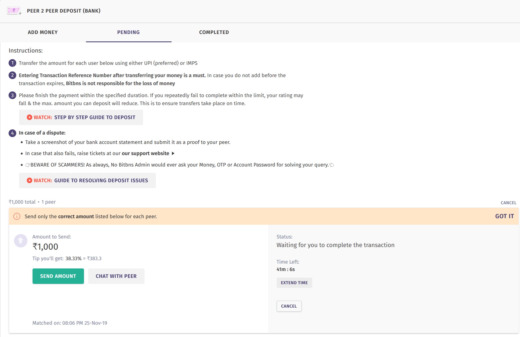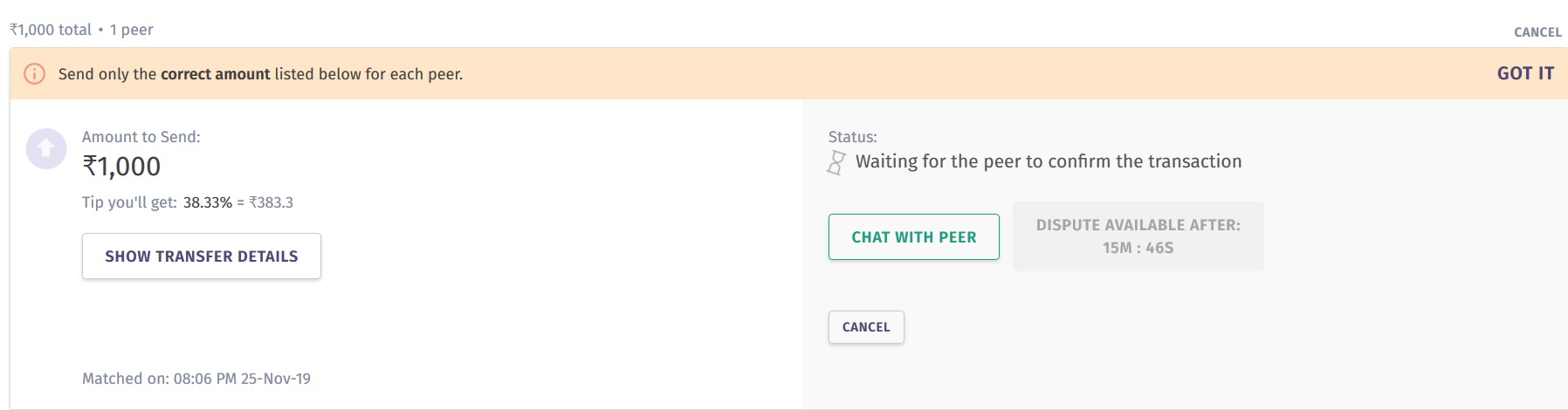 The tips in the P2P Bank Transfer looks very attractive, and you may feel, its going to give you a lot of profit, and the same did I feel and went to buy using P2P Bank Transfer . So I decided to deposit Rs 1000/- ( INR) AND clicked on P2P Bank Transfer and filled 1000 as amount. The system matches the matching withdrawals and shows up the tips amount that you are going to receive.