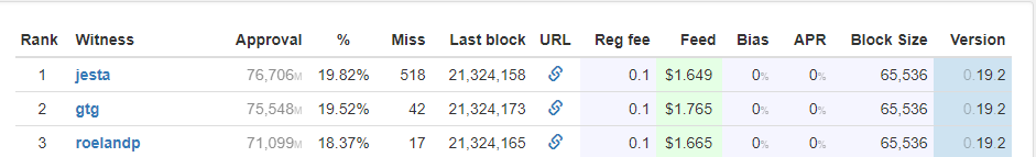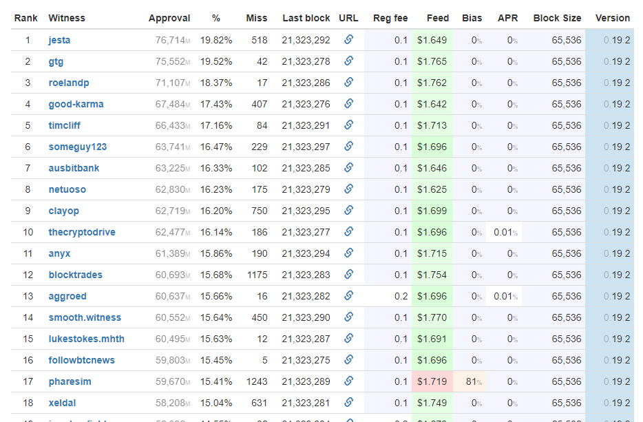 Quick picture-less concise explanations below cover the major topics of witnesses. I am resharing the table from https://steemd.com/witnesses so you can refer to it with these explanations