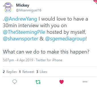 However, we might not be able to do it along! So get out there and retweet or like our posts and let Mr. Yang know there's a great and active community wanting to hear from him!
