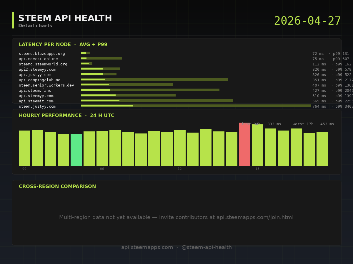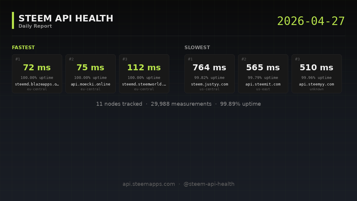 On 2026-04-27 (UTC) the monitor tracked 11 Steem API nodes with a global uptime of 99.89% across 29,988 measurements. Median latency across all nodes: 351 ms. Today's full picture and notable patterns below.