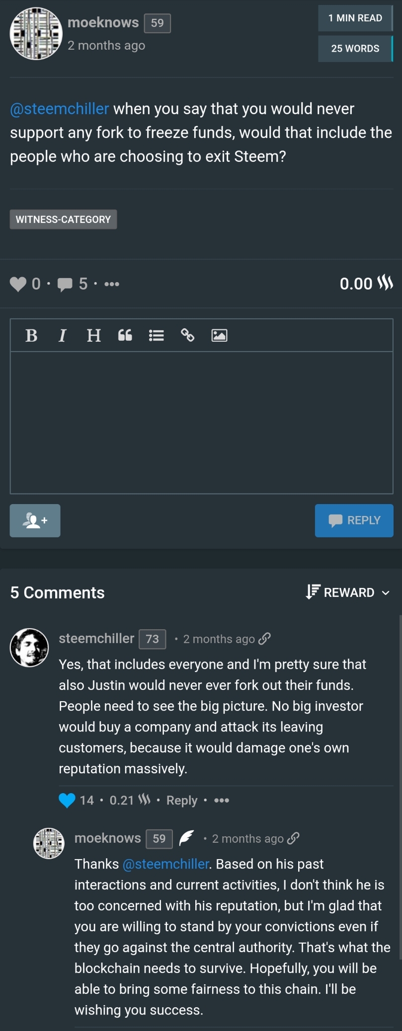 At that time I didn't know yet that they would really consider to destroy this blockchain. Without a functioning Steem blockchain there is no steemchiller, so he needed to act accordingly.