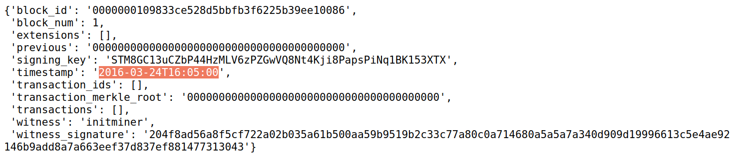 The first block was mined by @initminer at 2016-03-24T16:05:00.