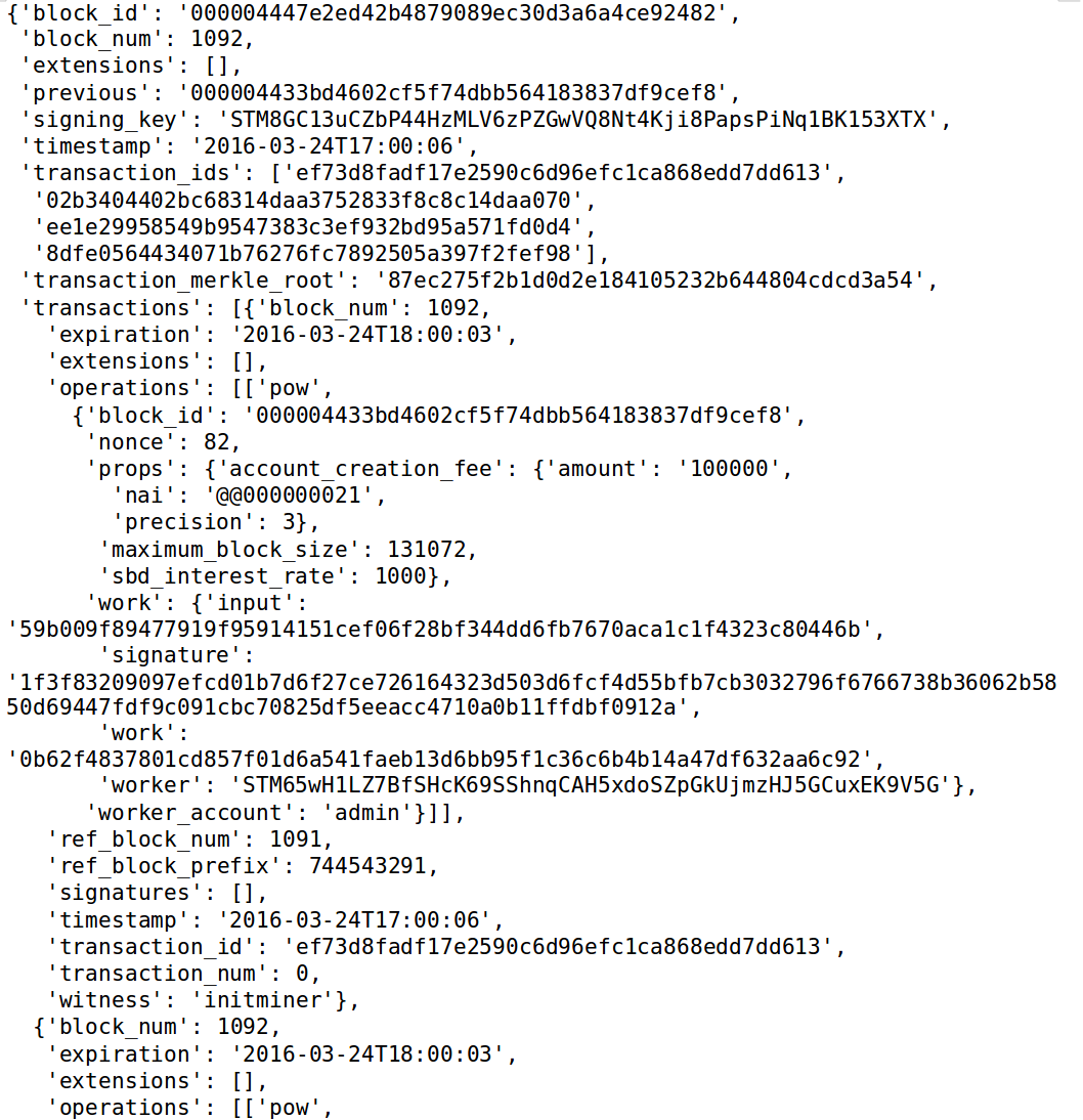 In every 3 second a new block created, and one the witneses will get revard to validate the block. As you can see above the first block did not have any transactions inside. We have to wait until 1092 block was mined.