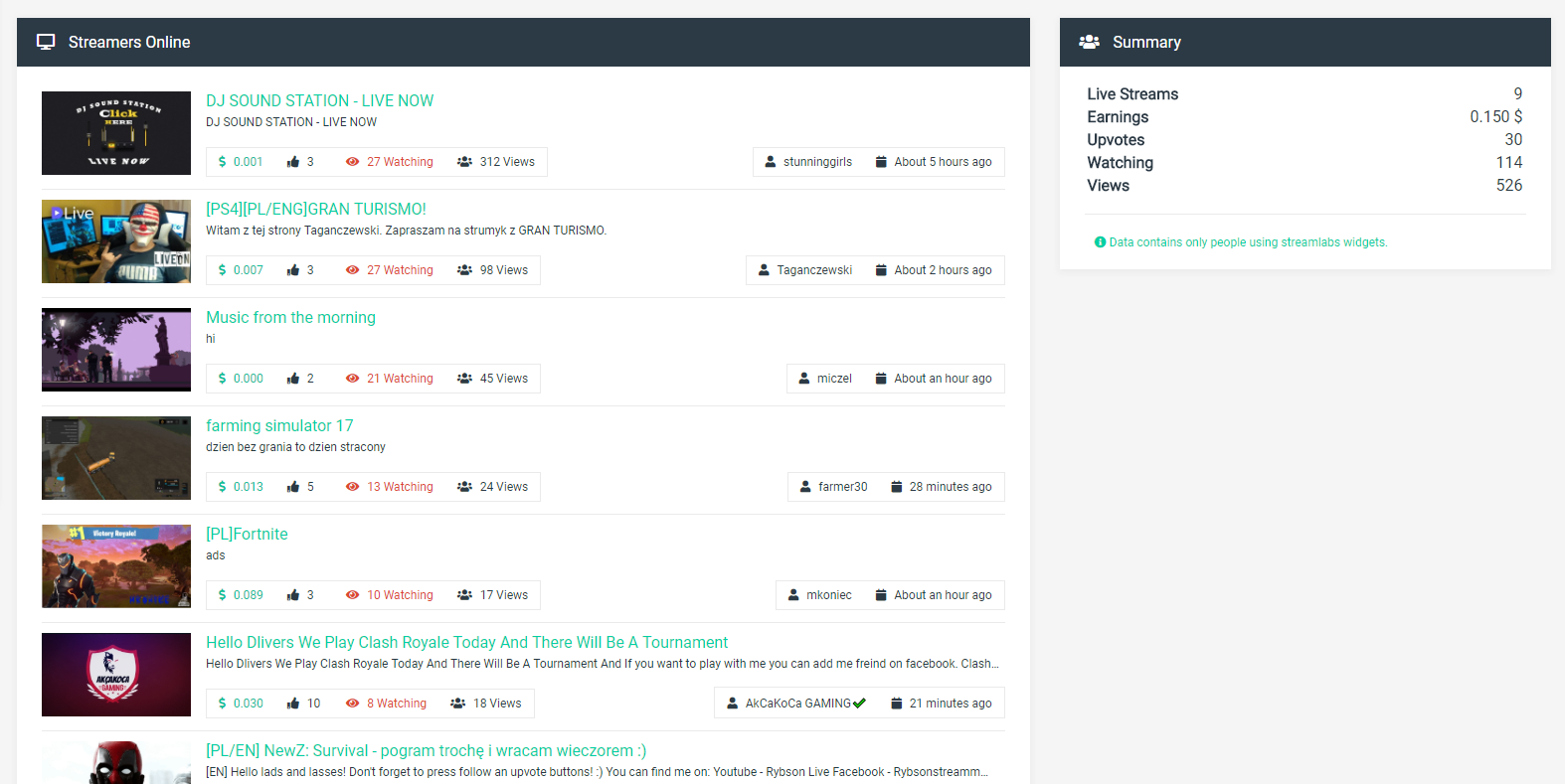 After this update you can check who is currently live streaming and uses our alerts and widgets. You can get quite more information not only who is streaming but also how much they earned in upvotes, how many upvotes they got, how many people watching their live streams and how many they have views. We have also added delegation page and now you can support our work by give your steem power to us, you can always get your steem power back. More about for we will use your steem power will be described in future posts.
