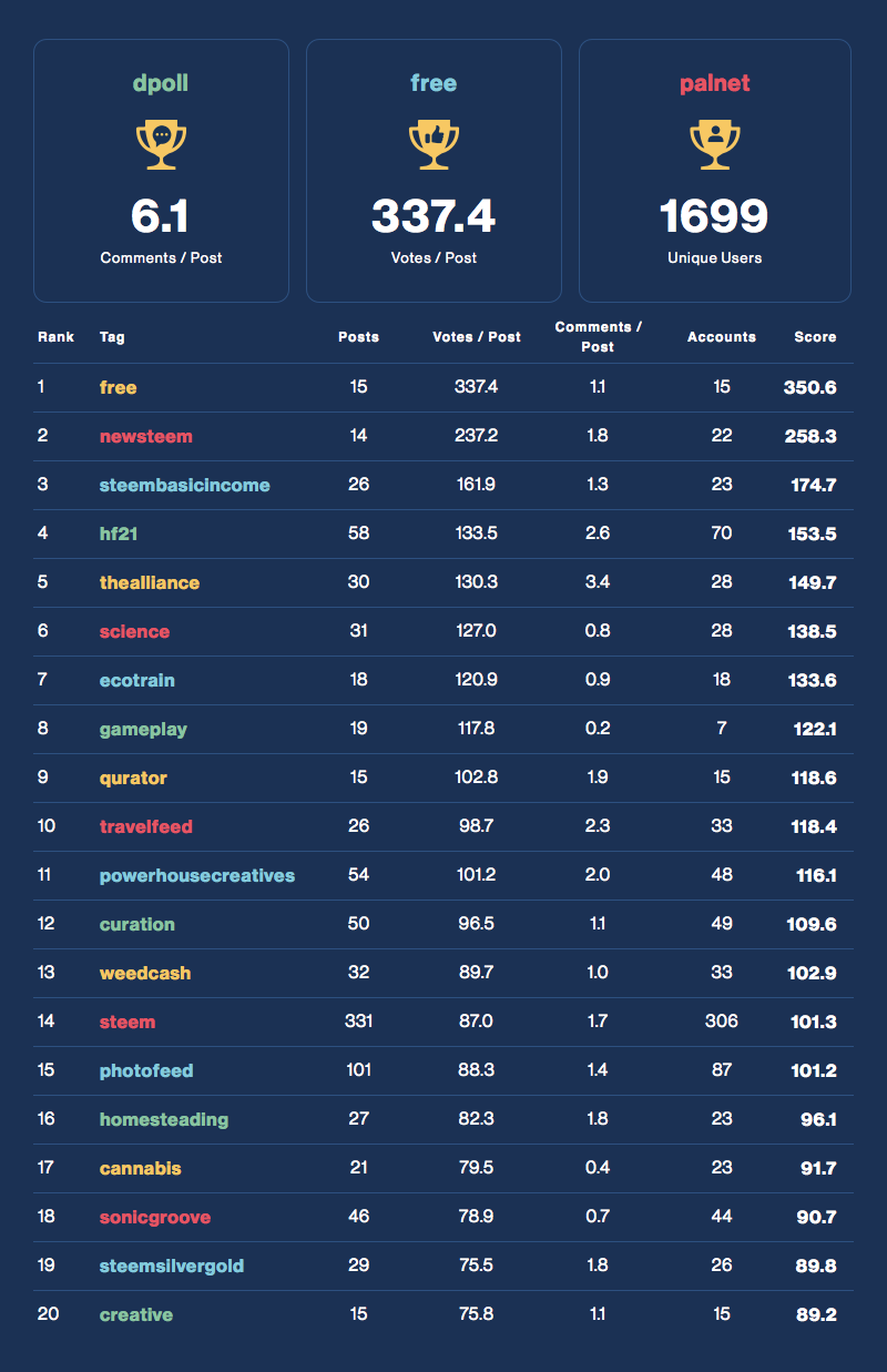 Each day we award and rank the top performing tags across the Steem ecosystem in terms of community activity. Find which tags are your best opportunity to connect to your community!