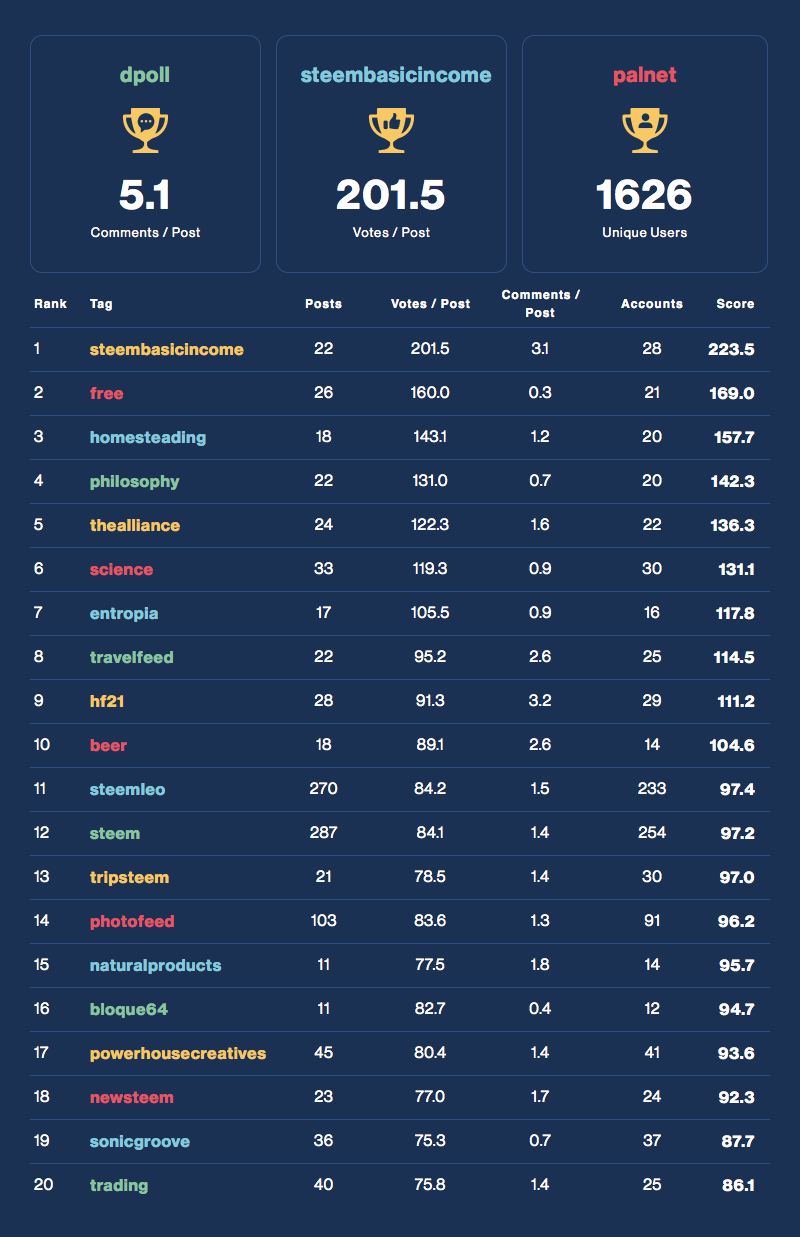 Each day we award and rank the top performing tags across the Steem ecosystem in terms of community activity. Find which tags are your best opportunity to connect to your community!
