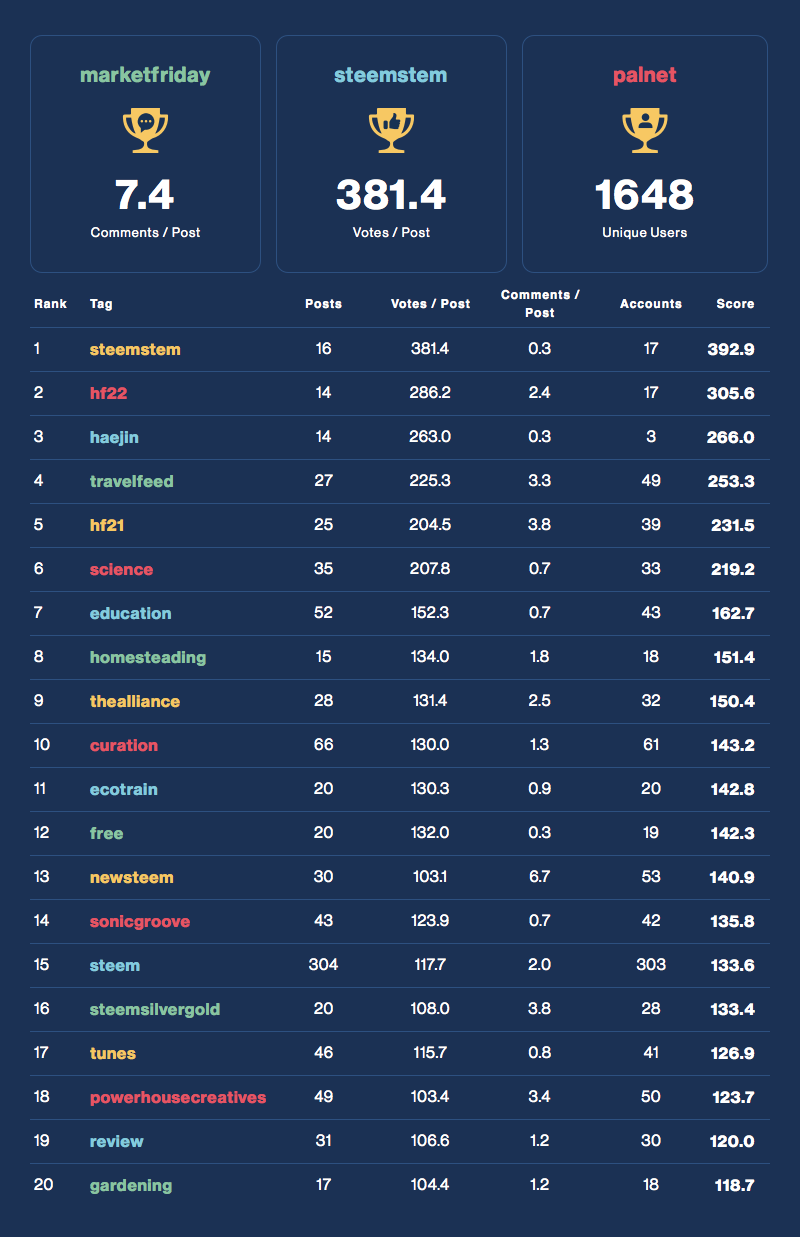 Each day we award and rank the top performing tags across the Steem ecosystem in terms of community activity. Find which tags are your best opportunity to connect to your community!
